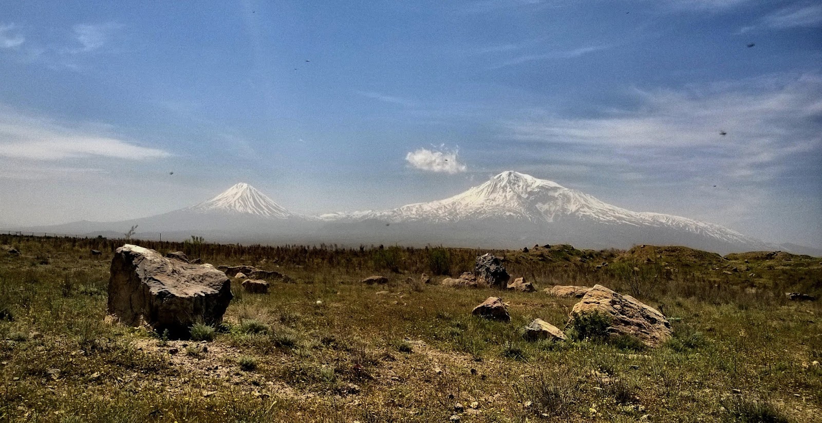 Here we reached the place. The place behind the monastery was like a desert. No any simple life could be seen except snakes. No any tree or a bush grows. Only sometimes small poppies and some other flowers shone under rare flowing sun rays. Bees started to fly over them. While we stood there and were working, clouds started to disappear. The sky was already blue. Sun started to shine with all its strength. Started to burn already, like in a hot summer day. To be honest, wasn’t that pleasant to stay inside the car for some hours and feel the heat. But would be worse to get out of it and burn under the sun. The only fact that was giving me positive vibes was the change of weather, the blue sky, shining sun and Ararat, clear Ararat, where the snow was also shining on the huge slopes of the great mountain.