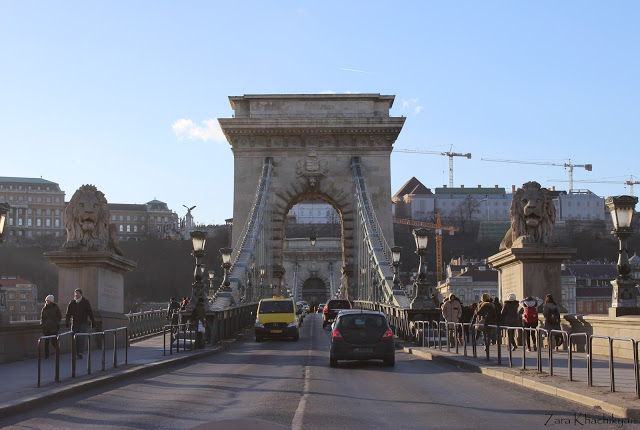 Anyway, we missed the giant man’s statue, but in front of us was the main and famous Chain Bridge, that was connecting Buda and Pest, the Western and Eastern parts of Budapest. Strong lions sitting on both sides of the bridge seem to protect it. The bridge starts on Pest from the Szechenyi square and goes over Danube River ending with Castle Hill Funicular, where we went after.