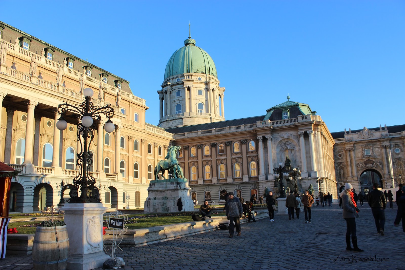 We passed the bridge walking and admiring with river waves, and reached the funicular, but there was a huge queue on the entrance, so we skipped it and walked over the Castle Hill, straight to the Buda Castle. This is a historical castle and Royal complex of Hungarian kings. In the past it has been called Royal Palace and Royal Castle. Now it’s a part of World Heritage sites in Budapest. Nowadays the castle is a complex of historical museums, which is surrounded with many sculptured showing the historical moments of Budapest. On the western forecourt of the castle there is also spectacular fountain showing a group of hunters led by King Mattias Corvinus with a killed deer under his feet.