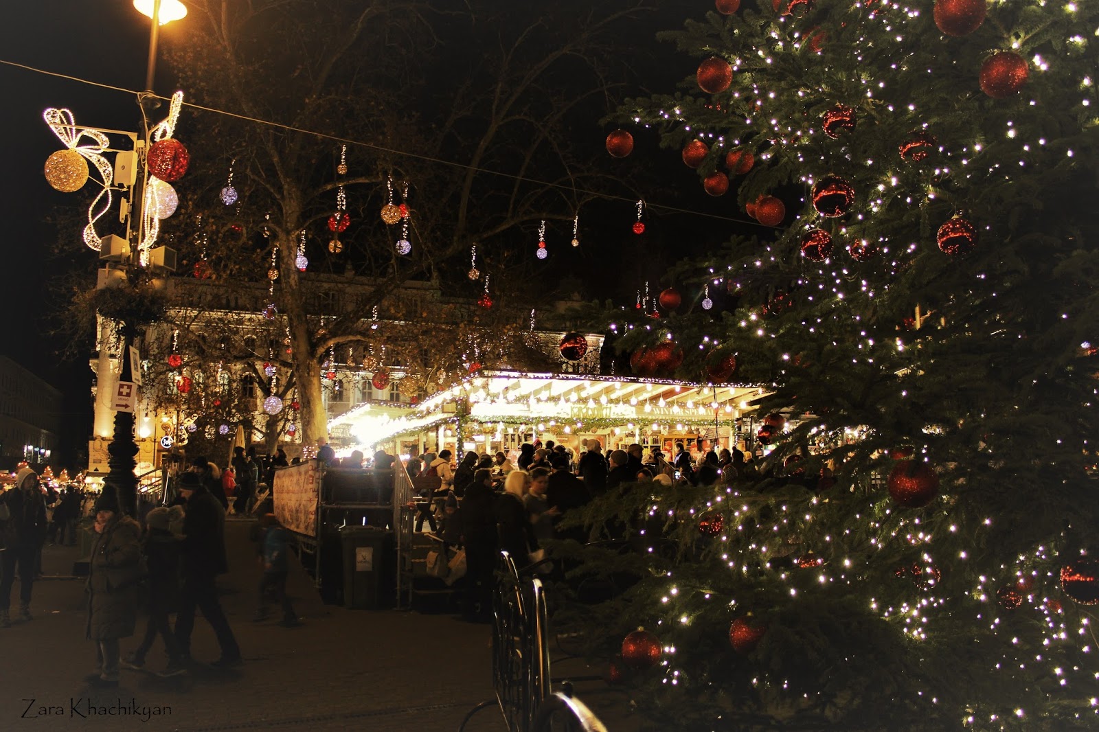 Having an early flight with sleepless night is not quite comfortable, but it gives a great opportunity to have all day free to spend in a new place. We landed in Budapest around 7am. New city welcomed us with shining sun and great weather. Usually at this time of the year (end of December) it’s cold and snowy here, but during our stay we didn’t have any drop of snow. Shuttle bus took us to the closest metro station, from where we took a metro to home. It was located right in the city center, in the heart of the city. Metro station Deak Ferenc Ter was the main connecting station for all metro lines, and our apartment that we rented in advance was only in a 2 minutes walk from it. We left the luggage there and started the journey. It happened that we were there after Christmas time, but the spirit of the fair was everywhere. Every street, every corner around was lightened with Christmas lights, and decorations. Behind our building was the beginning of a long line of Christmas markets, where you could find any kind of souvenirs, spices, dressings and even traditional food and drinks. The market was going along Vaci utca (Vaci street), crossing Vorosmarty ter (Vorosmarty square) and continuing to St Stephen’s Basilica. Vorosmarty ter was one of the main place, where people were located. Here were a lot of food markets with tables, where you could find any kind of food for any taste, starting from usual potato fries, until grilled pork and traditional goulash soup served right inside a bread-pane. Beautiful lights of Christmas tree were calling everyone to take pictures under nice decorated tree. On the evening hours there were different music bands playing live, singing national songs that made the evenings fun. The mandatory parts of the main squares with Christmas fairs were ambulance cars parked, that were ready to give help and free toilets, which is not less important!