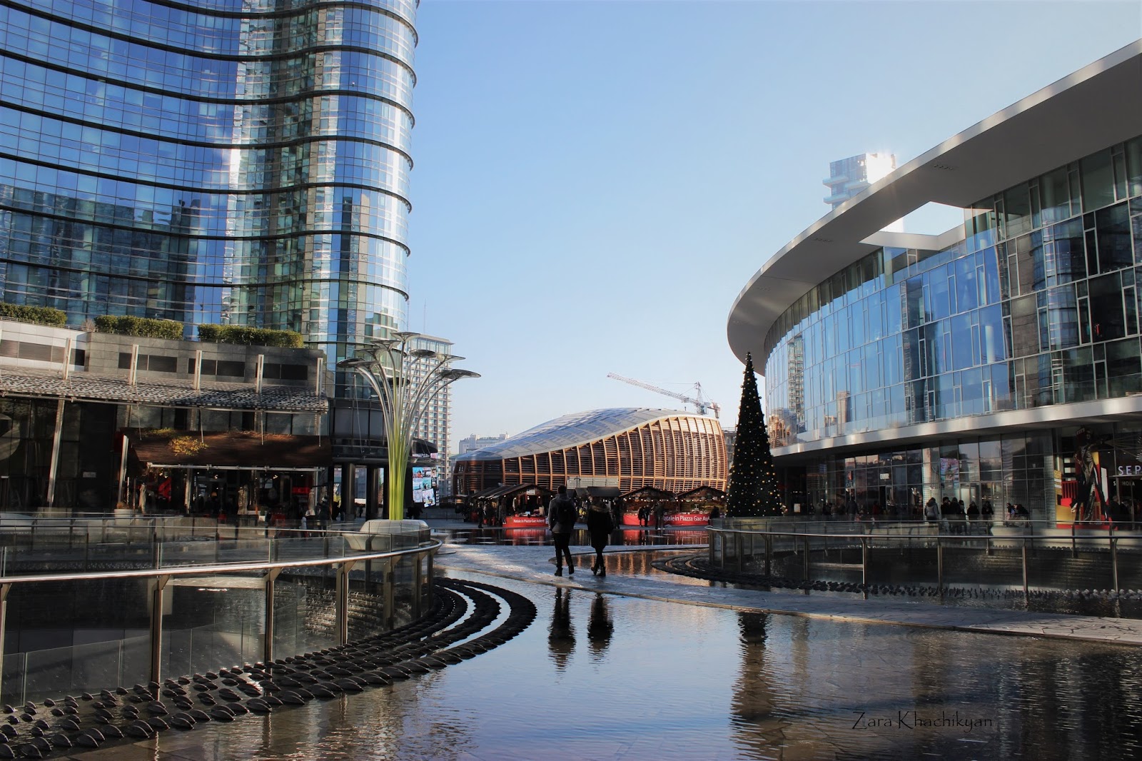 Piazza Gae Aulenti. This was a square with a new built fashionable UniCredit Tower, some luxury stores, one of which was the Tesla store with new stunning car models. From here there was also seen the famous green building, with lots of plants on the windows. Of course at this time of the year it wasn’t that green, but during the season it would really look nice. But we were surprised seeing blossoming trees on this square at this time, as usually trees should start blossom in march. Light pink colored flowers were all on the trees. It was almost spring spirit here.