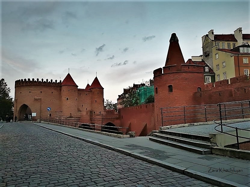 And here you’ll see one of the major tourist attractions of Warsaw that connects the Old and New Towns, the Warsaw 4-tower Barbican, which is one of the main remaining relics of the complex network of historic fortifications that once encircled Warsaw starting from 1540. It was 14m wide and 15m high from the bottom of the moat, which surrounded the city walls, and extended 30m from the external walls. It was built to protect the city but was used only once in 1656 during the Swedish invasion. During World War II Barbican was largely destroyed, but was rebuilt after the war, as well as the other buildings of Old Town.
