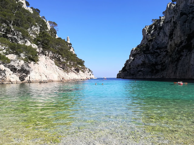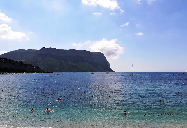 Here from the top of the hill, before going down close to the water you can easily see how the narrow inlet is becoming larger and larger and is merging with Meditteranean sea, from where the ferries and boats were coming through the limestone rocks and showing people how amazing corners are hidden here in this mountains. As this is the second closest calanque to Cassis and has a better beach area than the previous one, the most of the tourists were coming and stopping here for a picnic or for swimming. And considering the number of people, it was a bit noisy on the beach part, as many of them were here with kids, which were playing with the sand or inside the water and having fun with loud voices 😁. But there were also a lot of people doing snorkeling here, in this incredible blue water. Who knows what kind of gems they’d find there. And in fact the water had so many shades of blue that was keeping eye on it as a magnet. We also stopped here for a short break and picnic, sat on the rocks near the water, had some meal, enjoyed the sun, the breeze coming from the sea, the sound of splash of the water when people were jumping into it.