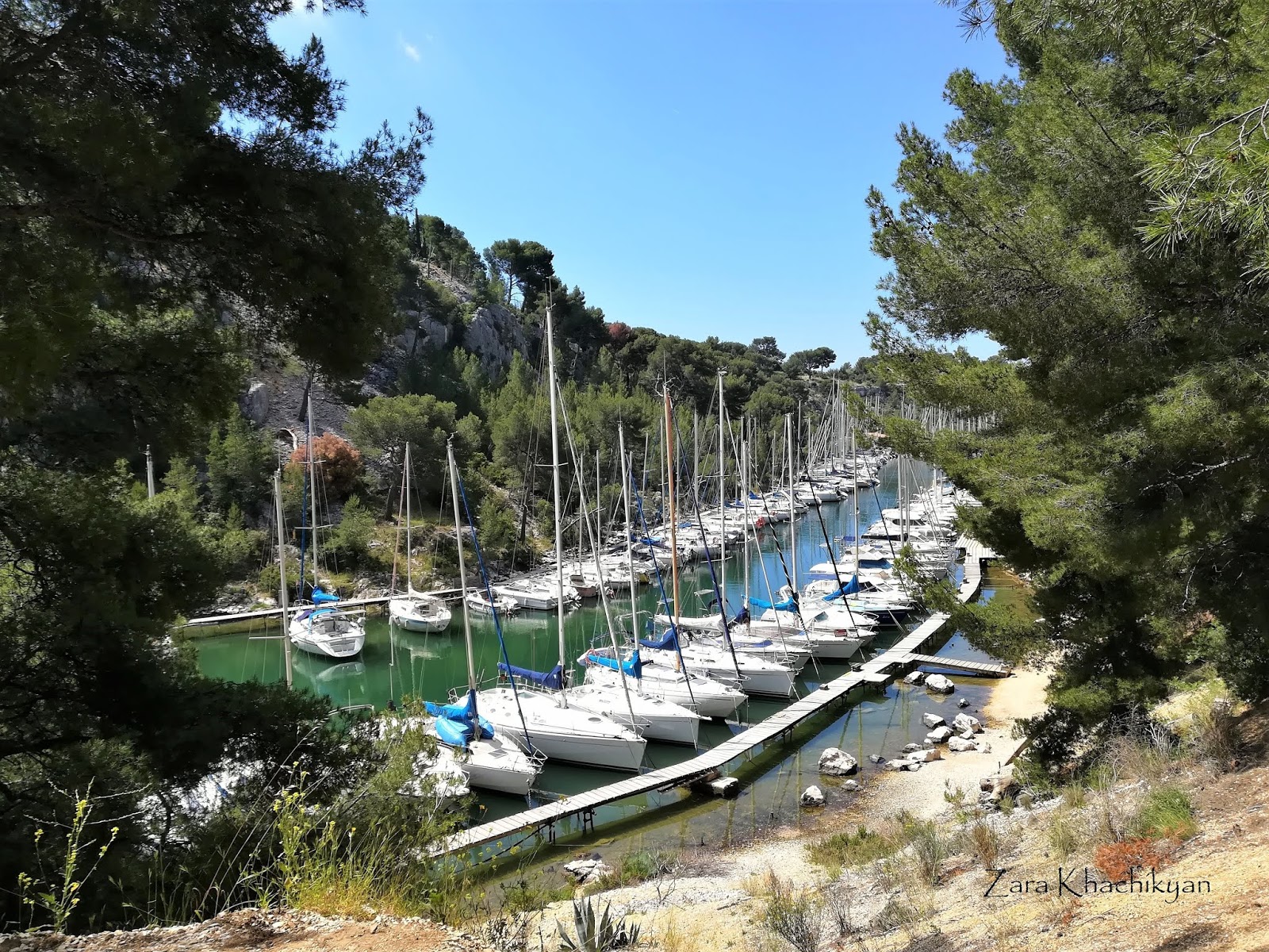 Starting from here our adventurous days starts. We are in the great National park of Calanques, which is considered to be one of the best National Parks in France. It is quite huge, but it’s not possible to go everywhere here in 1 day only. So we will hike to the main 3 biggest calanques here. A calanque is a narrow, steep-walled inlet that is developed in limestone, dolomite, or other carbonate strata and found along the Mediterranean coast. The first one that we passed was Calanque de Port-Miou, which was very long and narrow, and thus was very suitable for establishing a marina. Until now there were almost the same amount of boats as in the main harbor of Cassis. But this was considered to be the best port, which also shows the meaning of the name (Port-Miou → Pòrt-Melhor → the “best port”). Calanque de Port-Miou also had a small beach but we didn’t stop here. We had something better coming up.