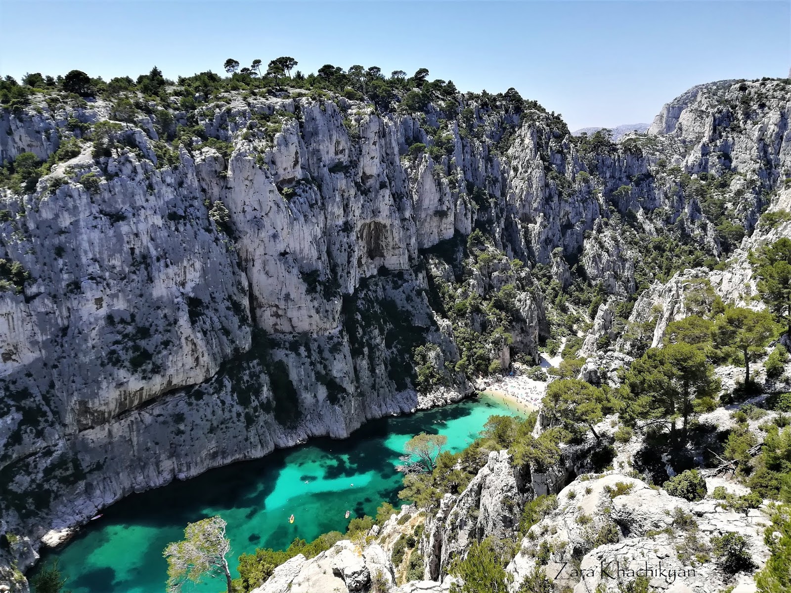 Seems we’d never reach the destination, but on the some point we stopped and saw what was waiting for us. The huge and incredible Calanque d’En-Vau. The view that we had was mind-blowing. The giant rocks were standing strong like a guards of the narrow calanque which water colors were shining under the sun rays and giving all possible shades. The beach downstairs seem to be full of people, which were hardly visible. I could never imagine the feeling I would have when I saw this from the first angle. On the other side of this rocks there was Marseille and its islands visible along with endless horizon of azure.