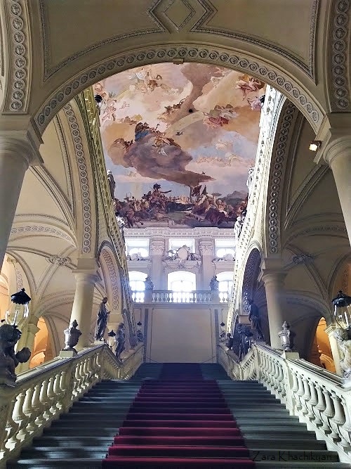 This was a huge building with gardens behind. We hurried to get in and visit the castle as it was going to close soon (but gardens would be open until dusk). We had to leave our backpacks (even if they were small) in lockers as it wasn’t allowed to take them inside (note: lockers need 1-2 eur deposit, which would automatically given back once you open the lockers back. So in general you leave your bags for free, but make sure to have coins with you). At the entrance we were informed that photography is not allowed inside, at all! And when we entered the first hall, looked up, I felt how my heart jumped from its place, how I stopped breathing because of the view I had in front of me. No any word can be enough to describe the beauty of this place. I’ve been in so many places, but never saw anything like this. All the ceiling was painted with vibrant frescoes that we couldn’t believe are real. But this was only the beginning. On the first floor there was a large room – Garden Hall, with huge windows opening to the garden. This was a bright room with another marvelous ceiling that you’d want to look without closing your eyes for even a second. Architect Balthasar Neumann’s world famous staircase (picture below) was leading us to the second floor from 2 sides.