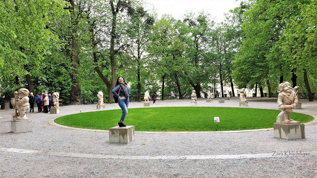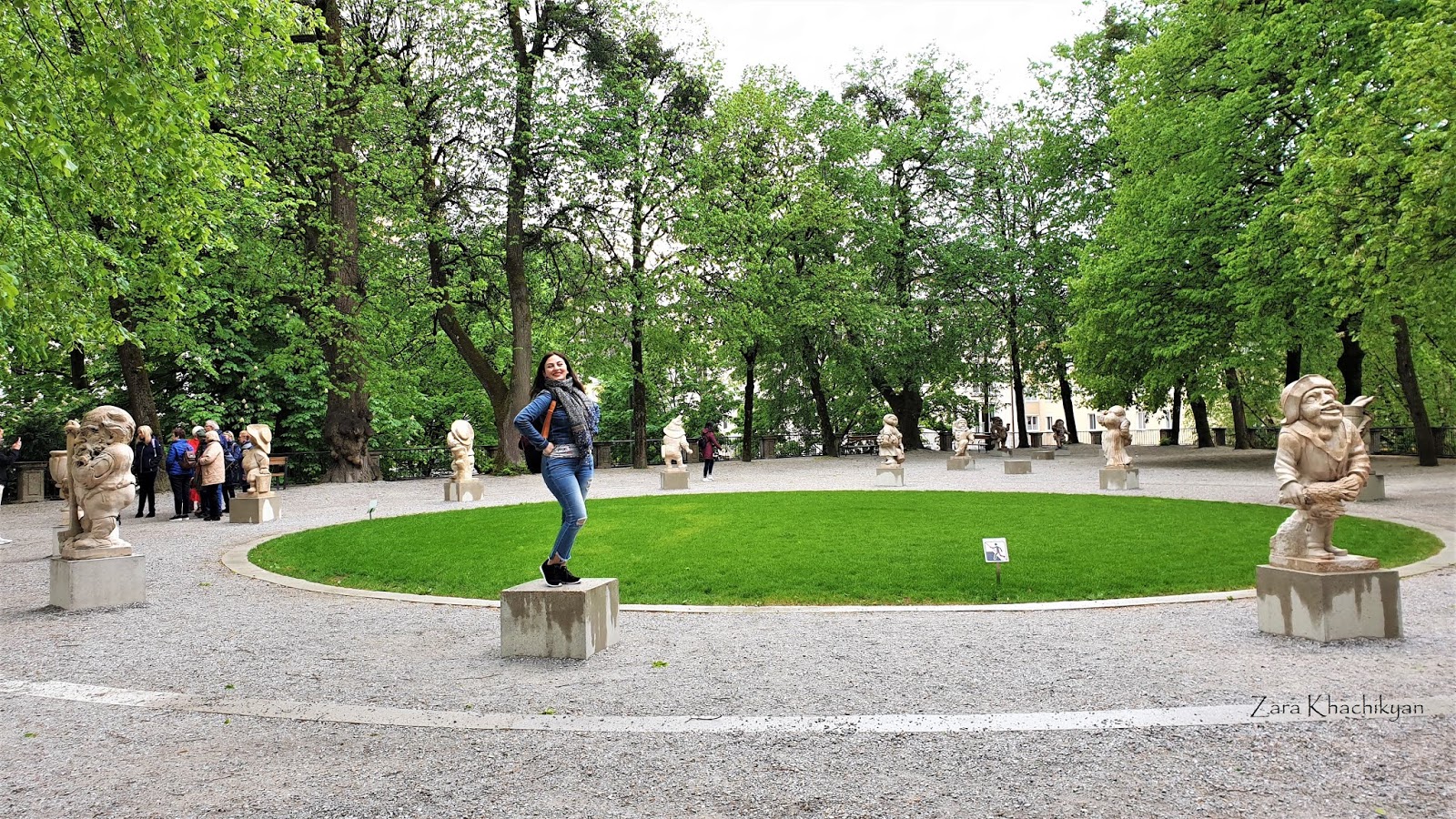 On the right side of the garden, just in front of the palace, there was another garden seen. This was something like a 2 floor garden area, which was still part of Mirabelgarten. On the upper side there were dwarf monuments standing in a round on small square stands. But one of those stands was empty, you can jump on it and pretend yourself one of those mysterious personages. And I did so π