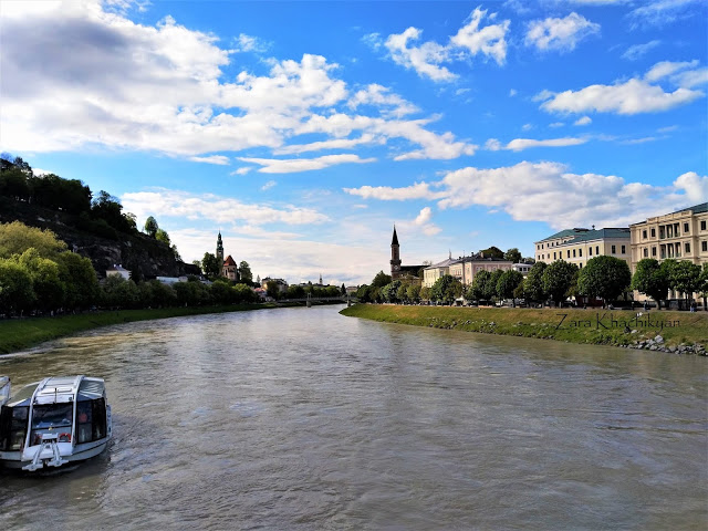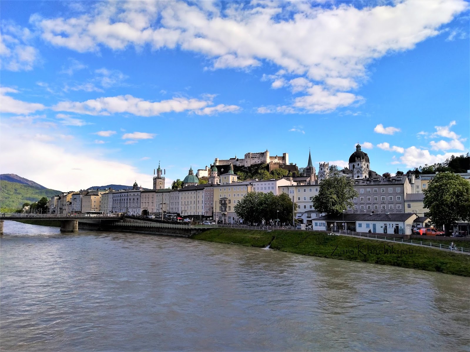 Suddenly sky started to be filled with dark clouds and just in a 5 minutes a heavy rain started. We had an umbrella, but it didn’t help much as the rain drops were coming from everywhere and made us all wet from feet to head βBut again, nothing can stop us! We went down the hill and found a shop to enter (not planned any shopping but this would be the best option to avoid getting more wet (if that was possible π€£). 5-10 minutes and rain almost stopped. We came out, walked more on the narrow old streets to the river. And as in almost every big city, here also we found a bridge full of locks on it. Clouds started to disappear as fast as they came, and the sky became blue again. We had a perfect view to the Hohensalzburg Fortress from the bridge. Some people found dry places to take a sit and look at this beauty, but we had to continue walking..