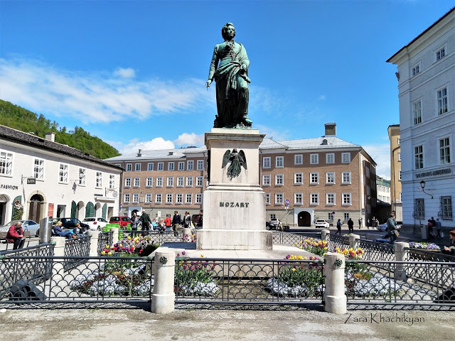 But let’s continue our journey. The garden was really nice, with a lot of flowers and fountains, many other statues everywhere and smelly purple wisterias flowing from the walls. This could be a great place for a nice photoshoot, especially on a good weather. But at that moment the sky was covered with grey and white clouds. From the garden there was a nice view over a hill, where we were going to go. When we exited the garden from the other side gates and crossed the street, we reached one of the Mozart’s houses (in fact there were 2 of them in Salzburg). This was the his former residence, but was more related to Wolfgang’s father Leopold, who was also a well known musician and composer. The house-museum where Wolfgang was born and raised was on the other side of the Salzach river. I hate when we are being limited with time and cannot enter such places, where 5 minutes won’t be enough to make a quick check.. so we skipped this and went to meet Mozart at the Mozartplats!