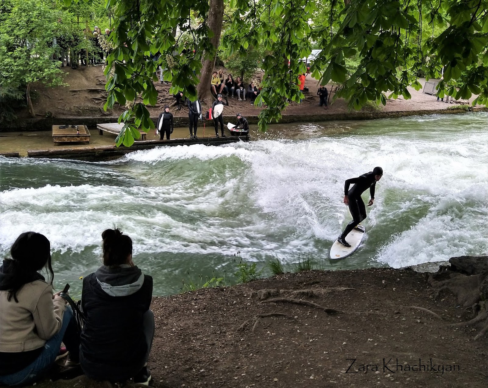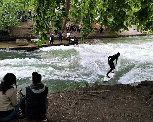 But the garden can surprise you in different ways. Have you ever seen surfers in the city? Here you can! As already mentioned, the garden is too large and has several entrances from each side. Here, next to the Haus der Kunst, close to one of the entrances you can see some surfers on the Eisbachwave. Surfing has been legalized in the summer of 2010, however, this permission is only for experienced surfers. When I was there, I saw around 10-15 surfers which were trying to stand on continuous waves of Eisbach river. This was a fun place to sit, relax and watch people surfing.I took one of the entrances (or exits) to leave the garden, which was somewhere in between of Chinese Tower and Monopteros and I saw a small building hidden in the trees. This was a small Orangerie, where periodically different exhibitions were being organised. The entrance was free. No one around, except a nice woman watching it over. I entered to the bright room all covered with beautiful paintings. Believe me, I was feeling so lucky that I took exactly this exit and had a chance to see this beautiful piece of art in the garden. Try your luck too and see whose paintings will be on shown your visit.