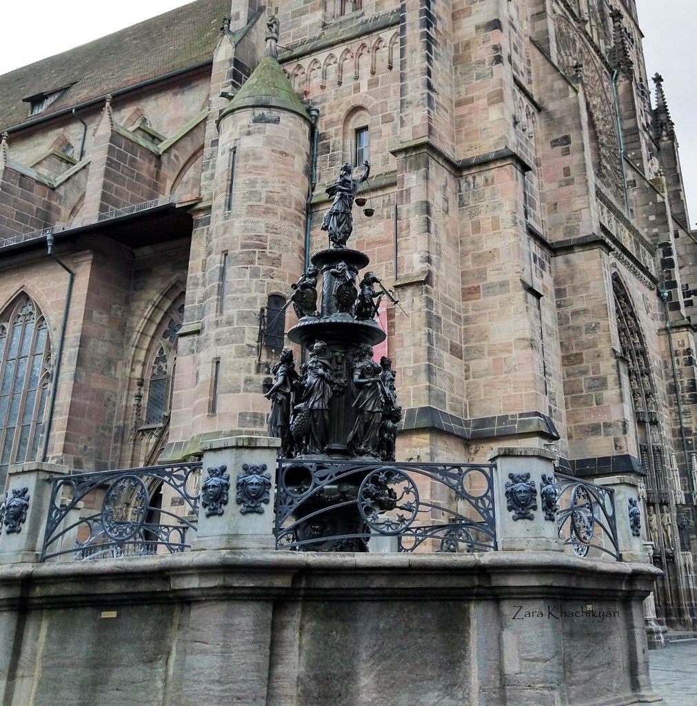Just next to the St. Lorenz church you can see the Tugendbrunnen, The Fountain of Virtue, which is one of the most iconic landmarks of Nurenberg, completed in 1859. The fountain depicts seven important human virtues: Justice (can be easily identified by a scale and a blindfold) as the most important virtue is placed on top, the other six virtues circle the bottom level of the fountain. Faith carries a cross, Love is identified by two children, the symbol of Hope is an anchor, water jug signs the Temperance, a lion symbolizes Generosity while a lamb stand for Patience.