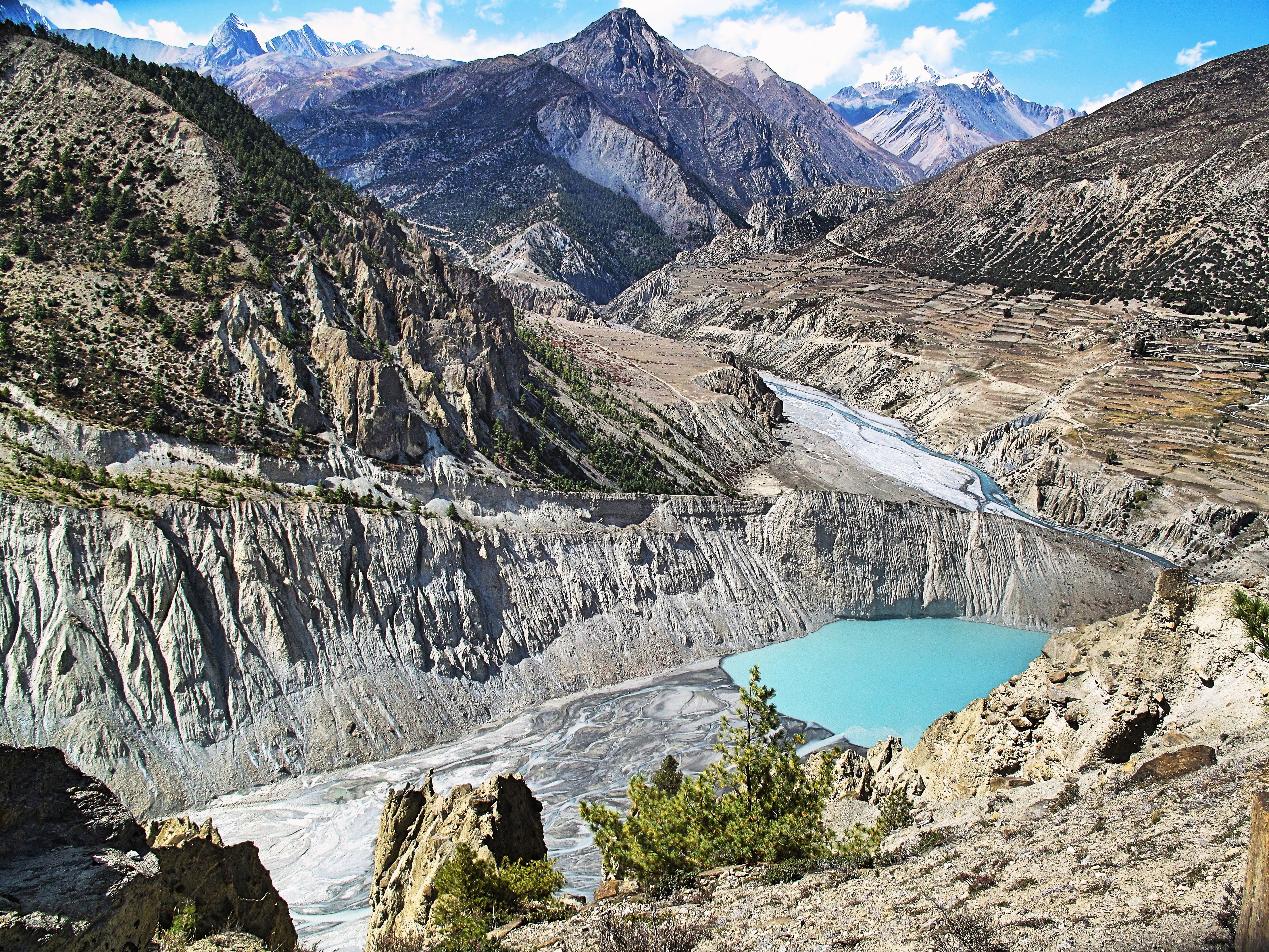 Village Manang in Nepal is the almost obligatory acclimatization stop for most trekkers on the Annapurna Circuit. Here just in 15 minutes walk from the village, you can see also Gangapurna lake at altitude of 3540m which feeds from a glacier slipping down the slopes of Mt. Gangapurna (7454m), Annapurna IV (7525m), Khangsar Kang and Glacier Dom. This lake is considered the second most desired tourist attraction after Tilicho Lake. Climb up a little bit more to have this breathtaking view to the lake and surrounding huge mountains.
