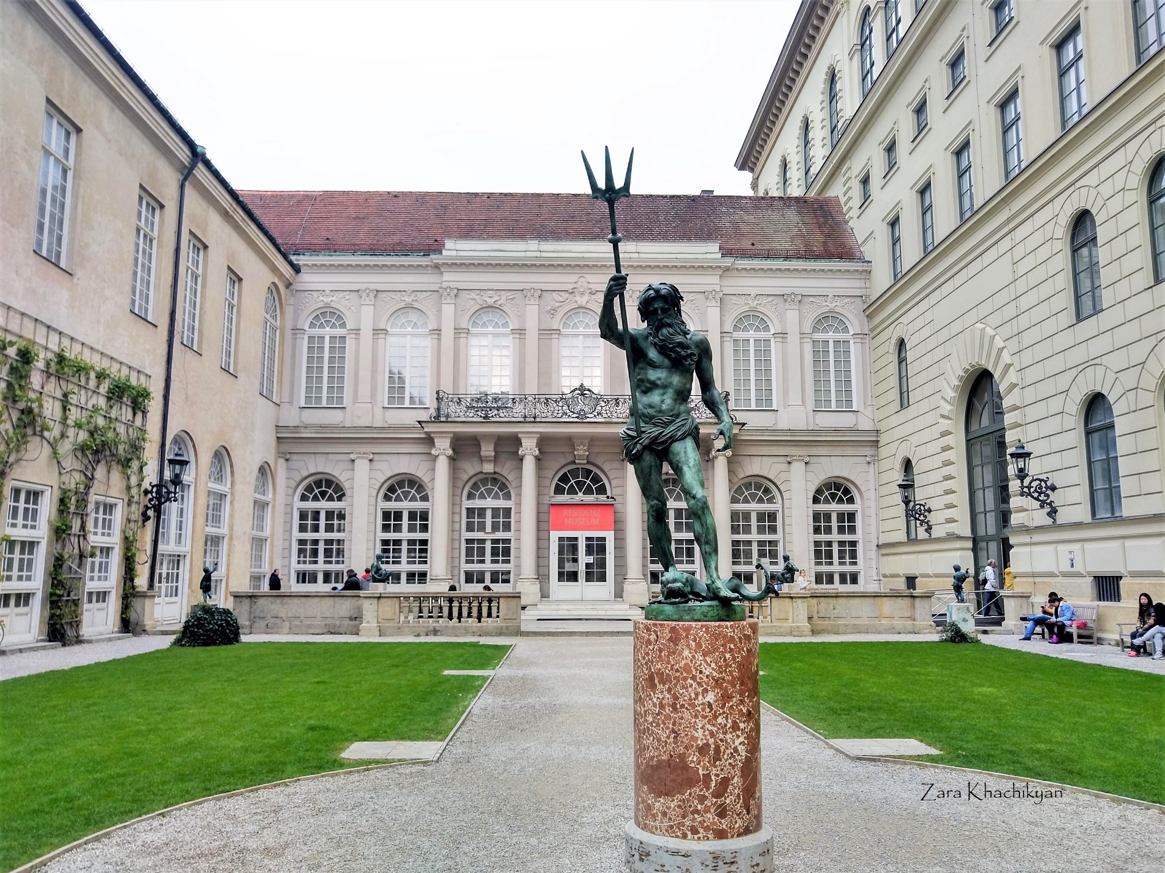 The Munich Residence has 10 courtyards which are open to public. Here are shown 2 of them. The first is the Royal Palace Courtyard (Königsbauhof), which is bounded in the east by the Green Gallery. You will see the statue of Neptune in front of the entrance to the building and some of sea-life creature statues around.