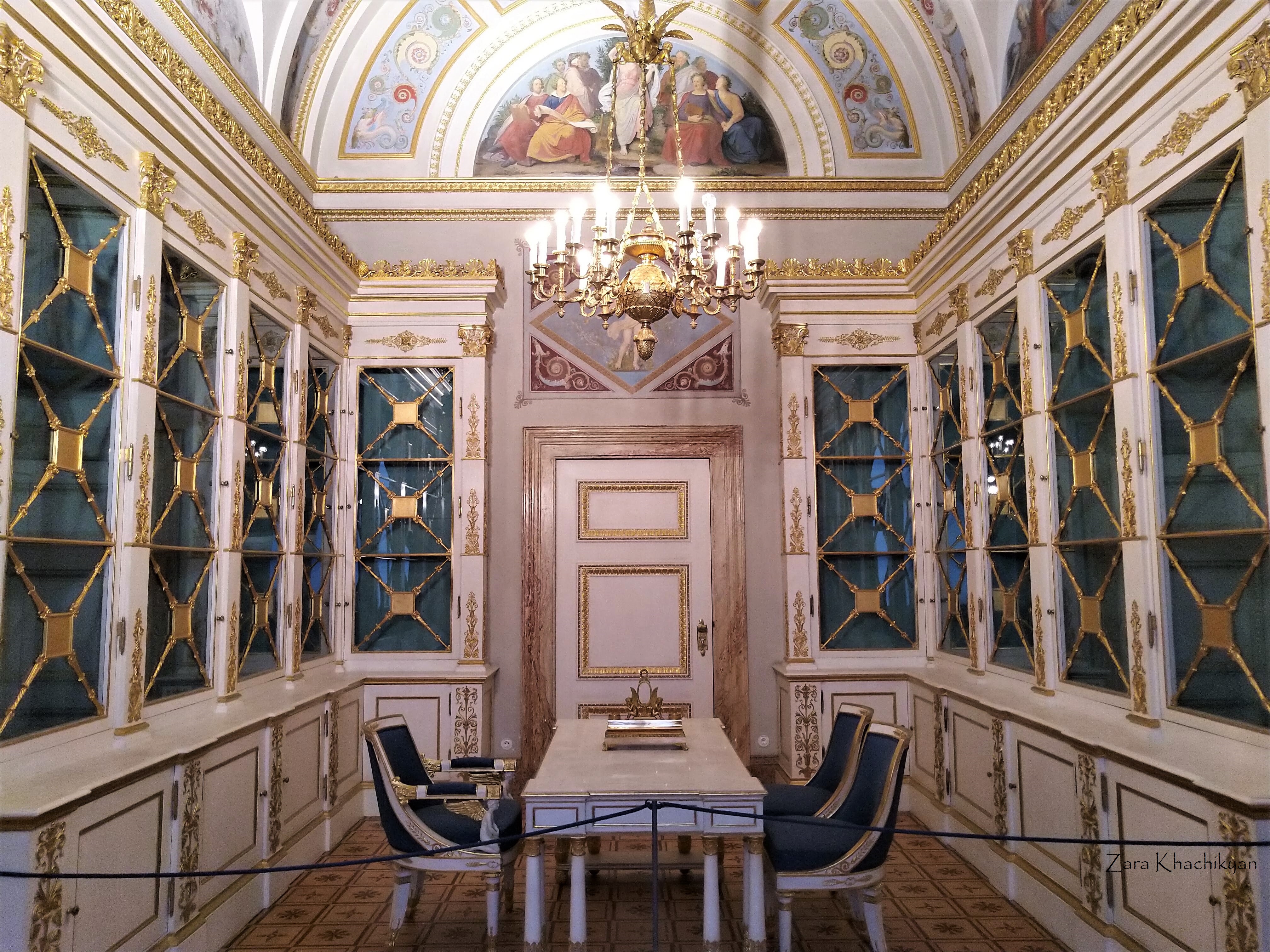 Here is also Queen Therese’s library, which is the last room in her apartment. Seems the turquoise was queens favorite color, as you can see, all mentioned rooms are decorated with this palette.