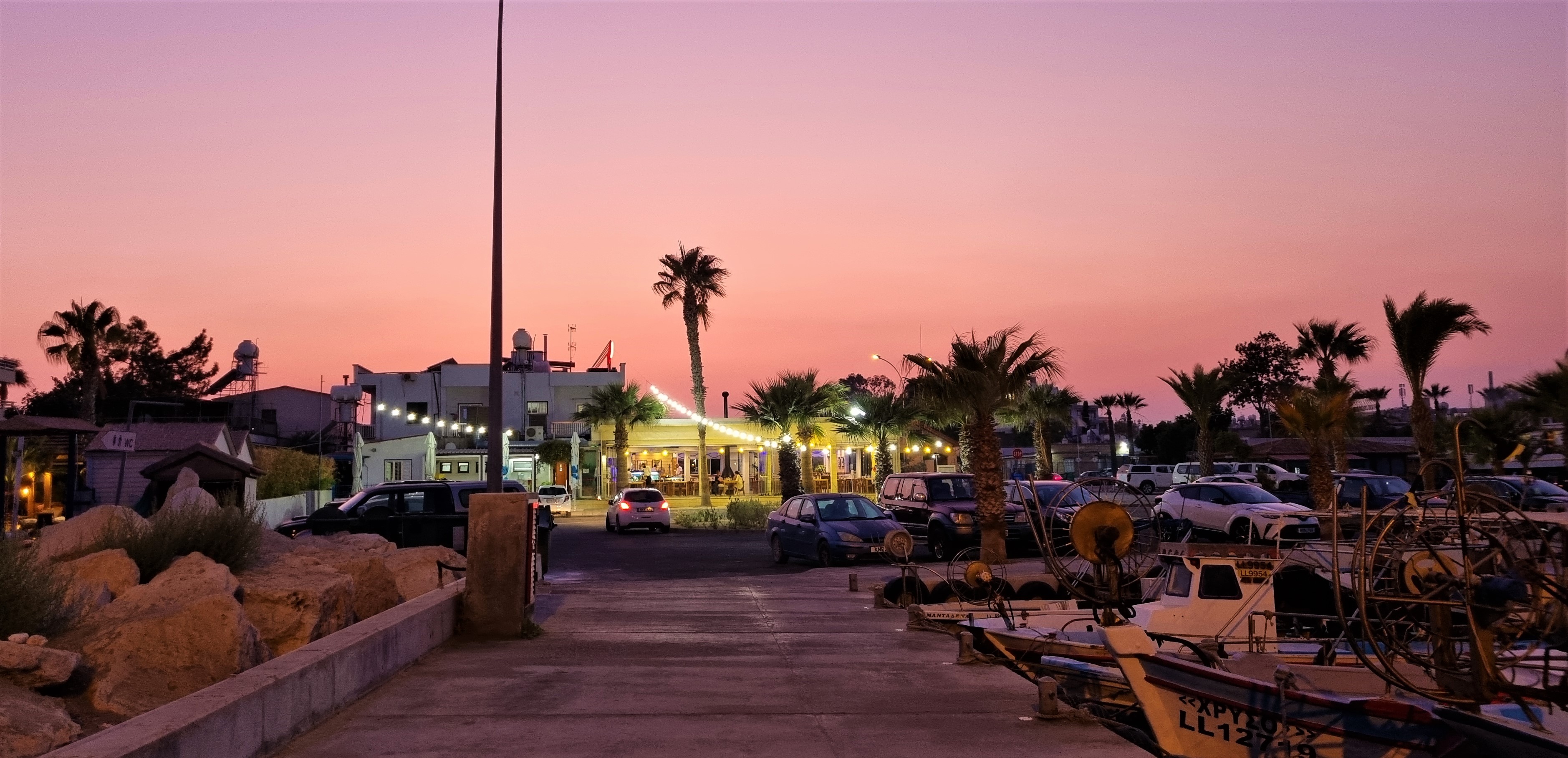 I’ve heard and read that the other beach in Larnaca has nicer sand, but didn’t have chance to check it myself. Instead at the end of the day we had a walk to its direction to enjoy the evening, we reached a rocky “border”, which was separating Finikoudes and Makkenzie beaches. There was a small harbor here, were a lot of small fishing boats were parked. Also from the restaurants nearby you can feel the smell of grilled fish. But look at this sky, what a purple sunset we had! This was magical.