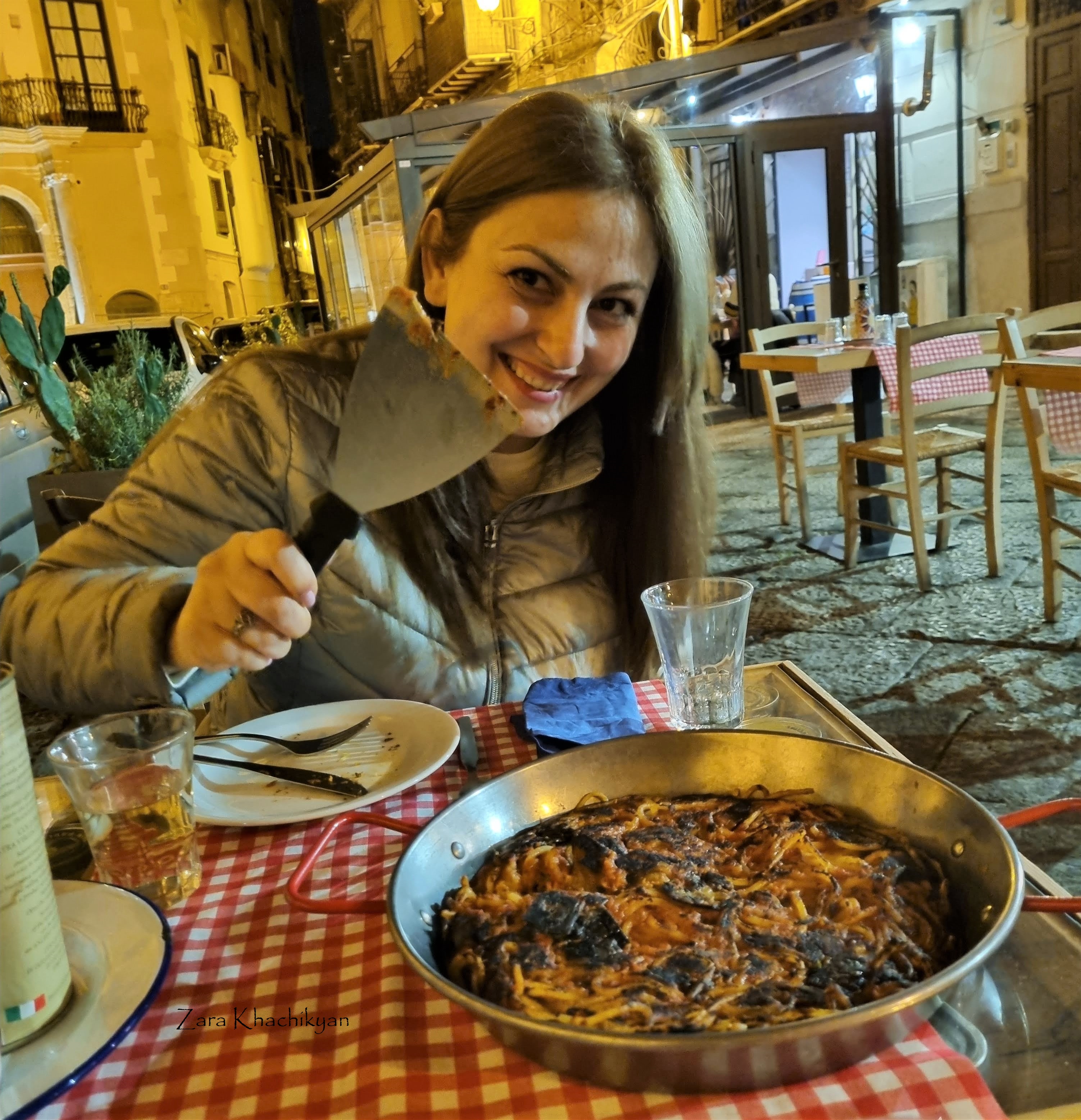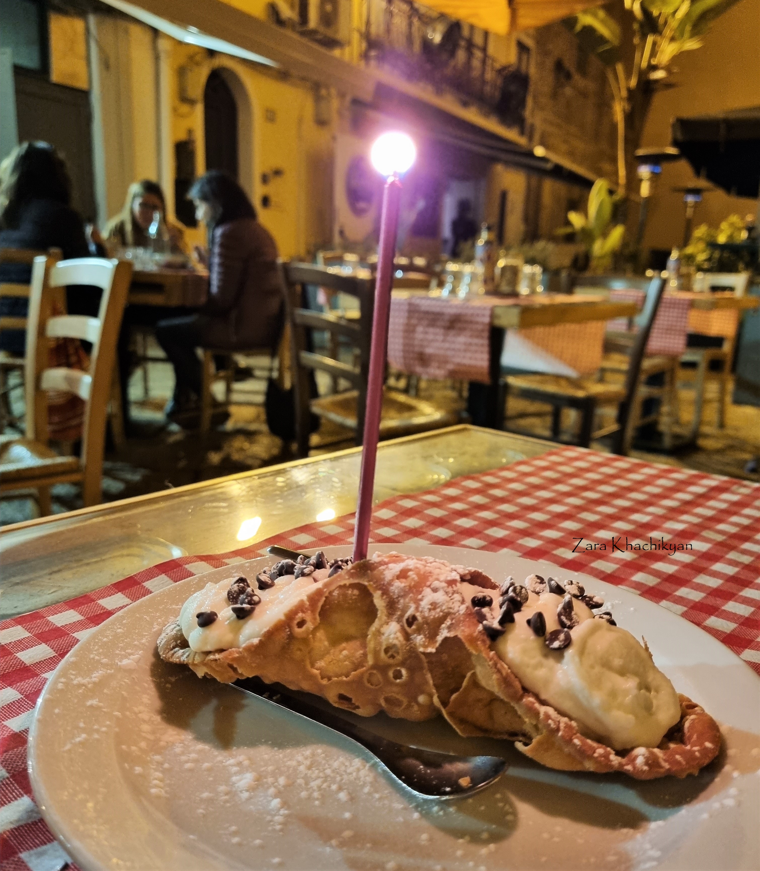 There were a lot of places we could sit, but when we asked our hotel receptionist where can we have dinner, which is not a touristic place, but more where locals go, he named this place. To be honest, we didn’t like the food much there, so don’t expect recommendations this time 🙂 At the restaurant we asked to bring something typical for Palermo, wanted to try something new and interesting. In the menu on our table we had something (sorry, don’t remember the name) with eggplants, potatoes and cheese like antipasti, Pasta alla Norma with eggplants (but it was fried for some reasons..), wine (which came in a water cups, not wine glasses) and cannoli (the worst I ever tried). And this is how we celebrated my birthday this time 🙂
