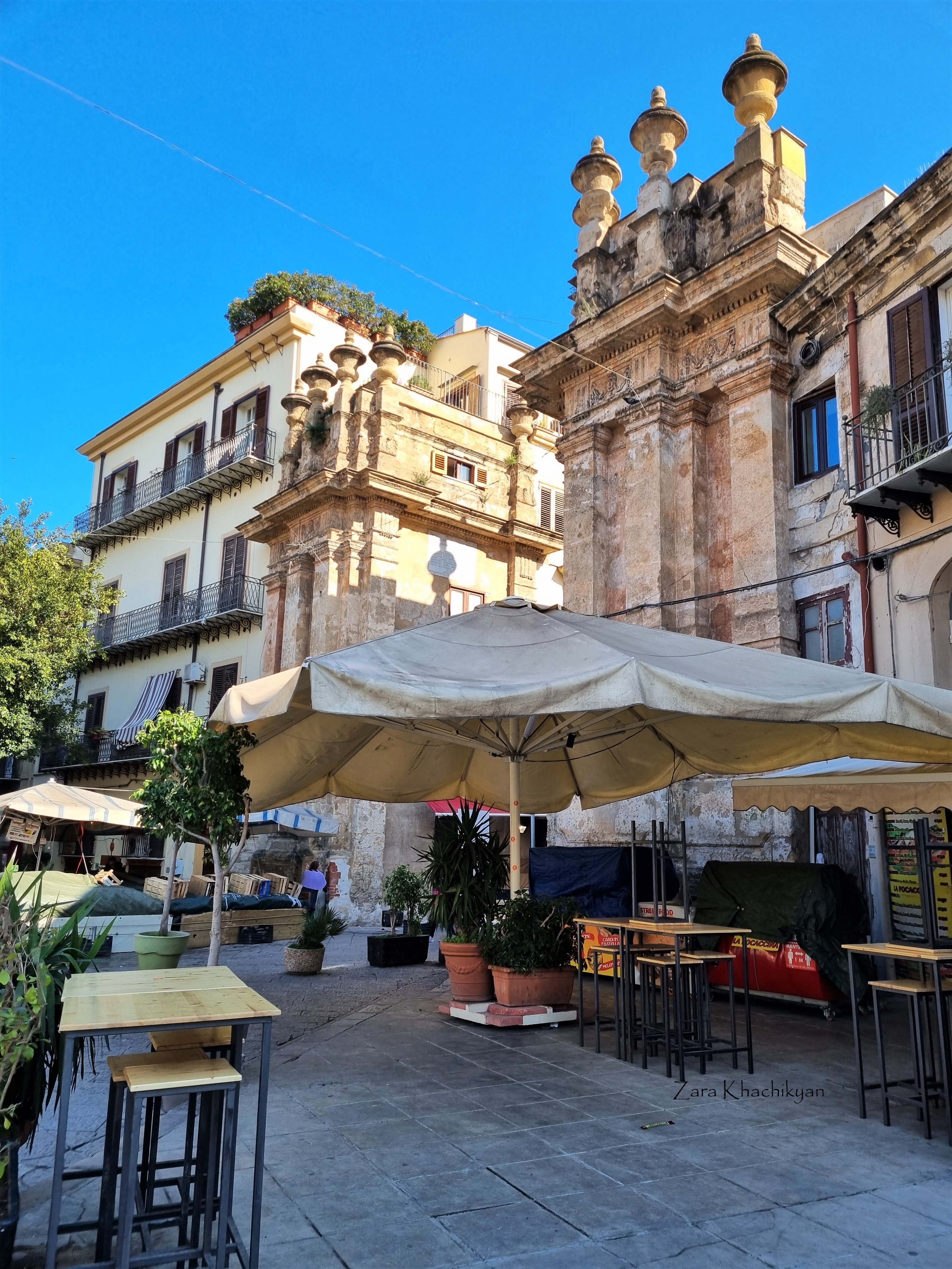 Here in Palermo city center there are 2 main walking streets, a pedestrian zone where people go for a walk. The main walking street in the Old Historical center of Palermo is Via Maqueda (AKA Strada Nuova) which is crossing with another one called Via Vittorio Emanuele. Those streets were super crowded especially in the evening hours. Here you can find all kind of shops and cafes, a lot of people selling any kind of thing on the tables, such as souvenirs, phone cases, street food, etc. No any car is driving here (almost). Only sometimes policemen can pass by you on a motorbike. But be careful not to be hit by teens on scooters. Here on those streets you can have all kind of food you’re looking for. Would it be a pizza or a pasta, potato chips or else, everything you can find here. Here is where I had probably the best pizza in my life and the tastiest Arancini, a typical Sicilian street food. This is a fried rice ball filled with different fillings (ham, cheese, etc.). The cost of one ball of Arancini was around 2 Eur, but believe me, it’s enough to make you satisfied for a long time.