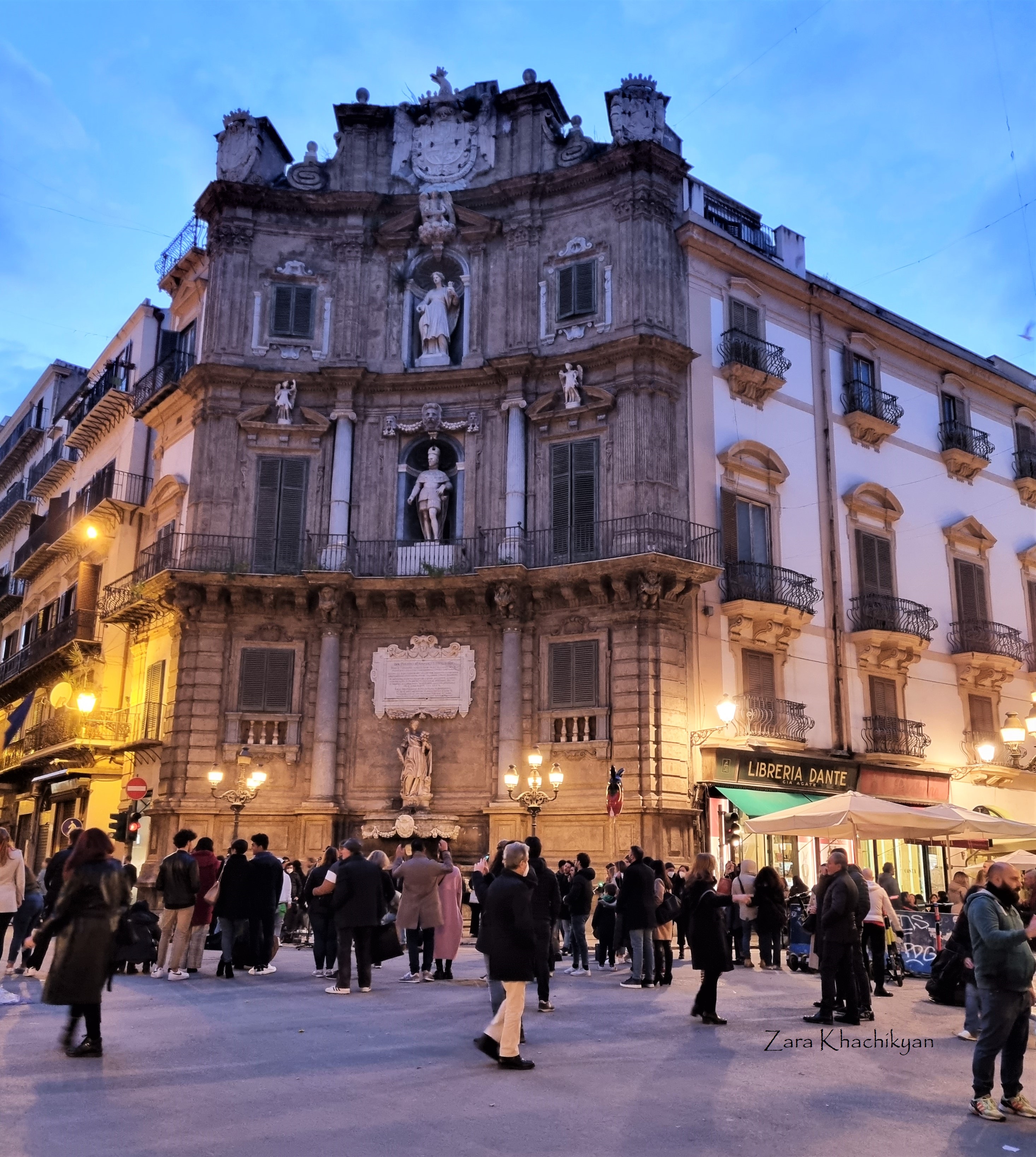 As mentioned, when we arrived to Palermo, it was already second half of the day (almost evening) on that day we made a real slow motion walk in the city, crossing all the streets nearby, checking what’s there, on which places we shall pay attention to come during a daytime for a visit or nice pictures. Everywhere we were walking were small or big squares and churches, or buildings decorated with statues and fountains. In my previous article I’ve mentioned about two main walking streets via Maqueda & via Vittorio Emanuele. So on the crossroad of those streets, which is also considered the center of the historic quarters of the city, you can notice a public square called Quattro Canti (lit. Four Corners), officially known as Piazza Vigliena. The interesting fact about those 4 buildings is that each fountain is topped by a figure representing a season: Spring is represented by Venus adorned with flowers; Summer and Autumn are represented respectively by Ceres, with fruits and crops, and Bacchus, while Winter is Aeolus with a lantern in her hand. The square, as well as the pedestrian streets, are always crowdy, as next to this Baroque style decorated 4 fountains you can also enjoy live music during evening hours.
