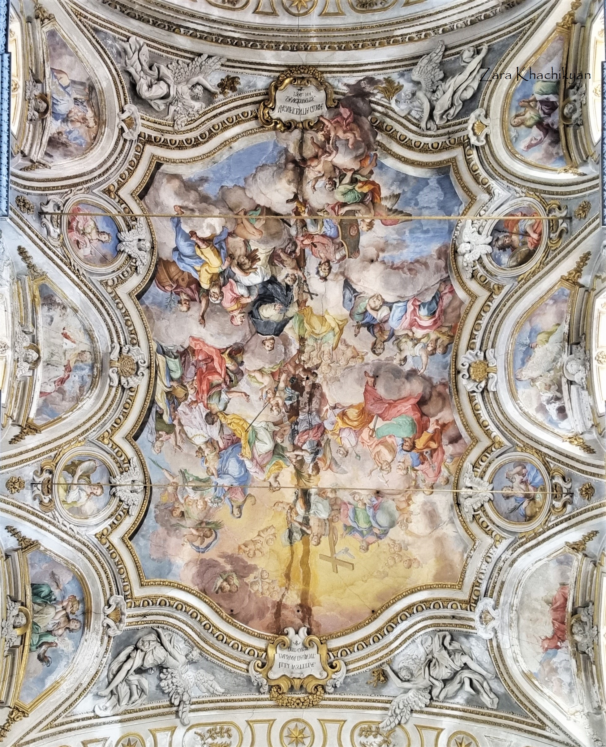 But the main reason we came to Piazza Pretoria was to visit the Church and Monastery of Santa Caterina d’Alessandria (It. Chiesa e monasterio di Santa Caterina d’Alessandria). The entrance of this Roman Catholic church built in the 16th century is from Piazza Bellini to where the main facade also overlooks, while from the Western facade you can see the Fontana Pretoria. When we entered the church, we were amazed with its huge size and breathtaking decorations. Every single corner of it made us speechless. The interior had a combination of Sicilian Baroque, Rococo and Renaissance styles. The church, that belongs to the cloistered monastery of the Dominican nuns, was built on a pre-existing building and was inaugurated at the end of the 16th century. The walls are all covered with marble inlay works, carvings and frescoes showing different religious topics.