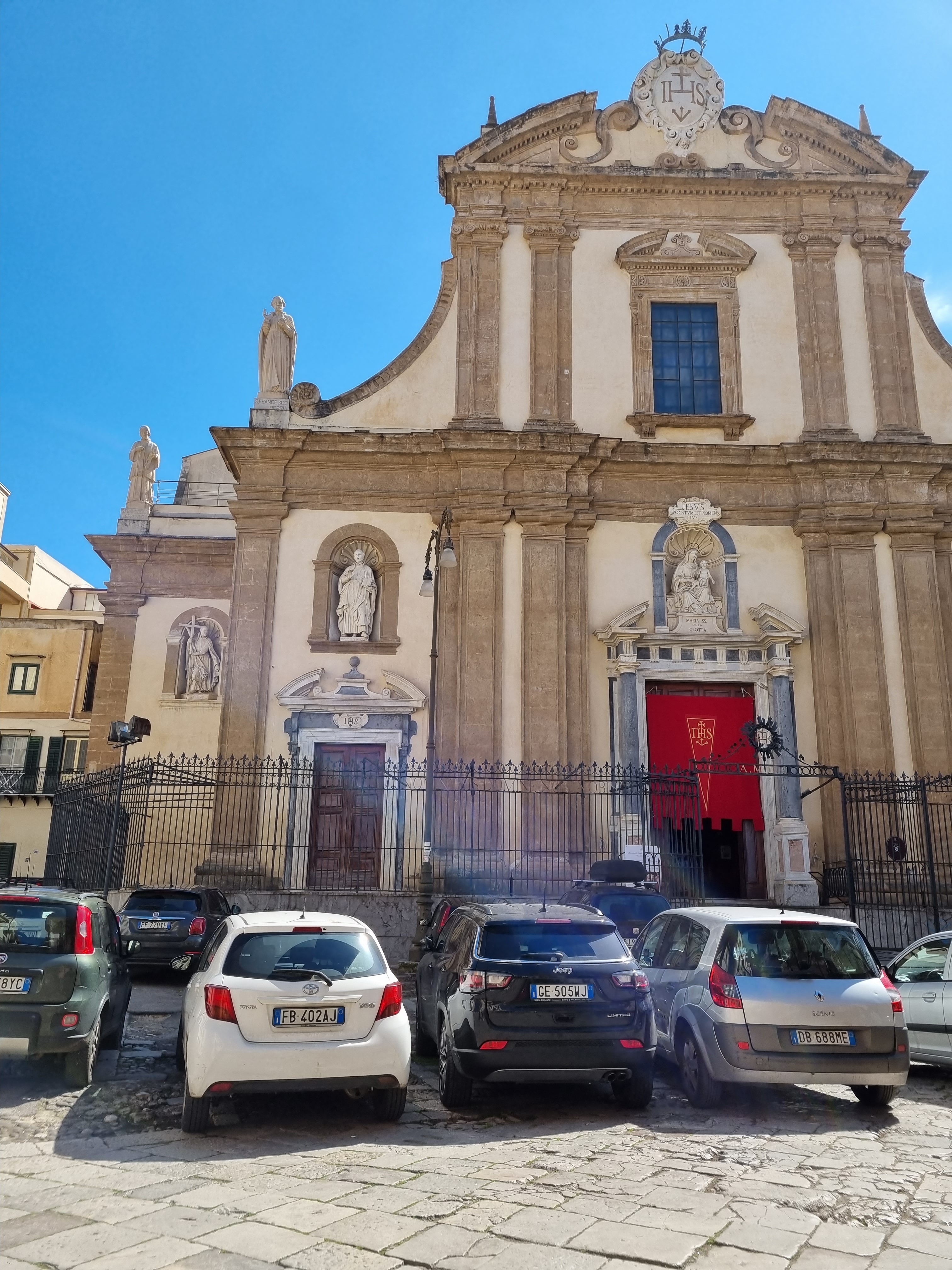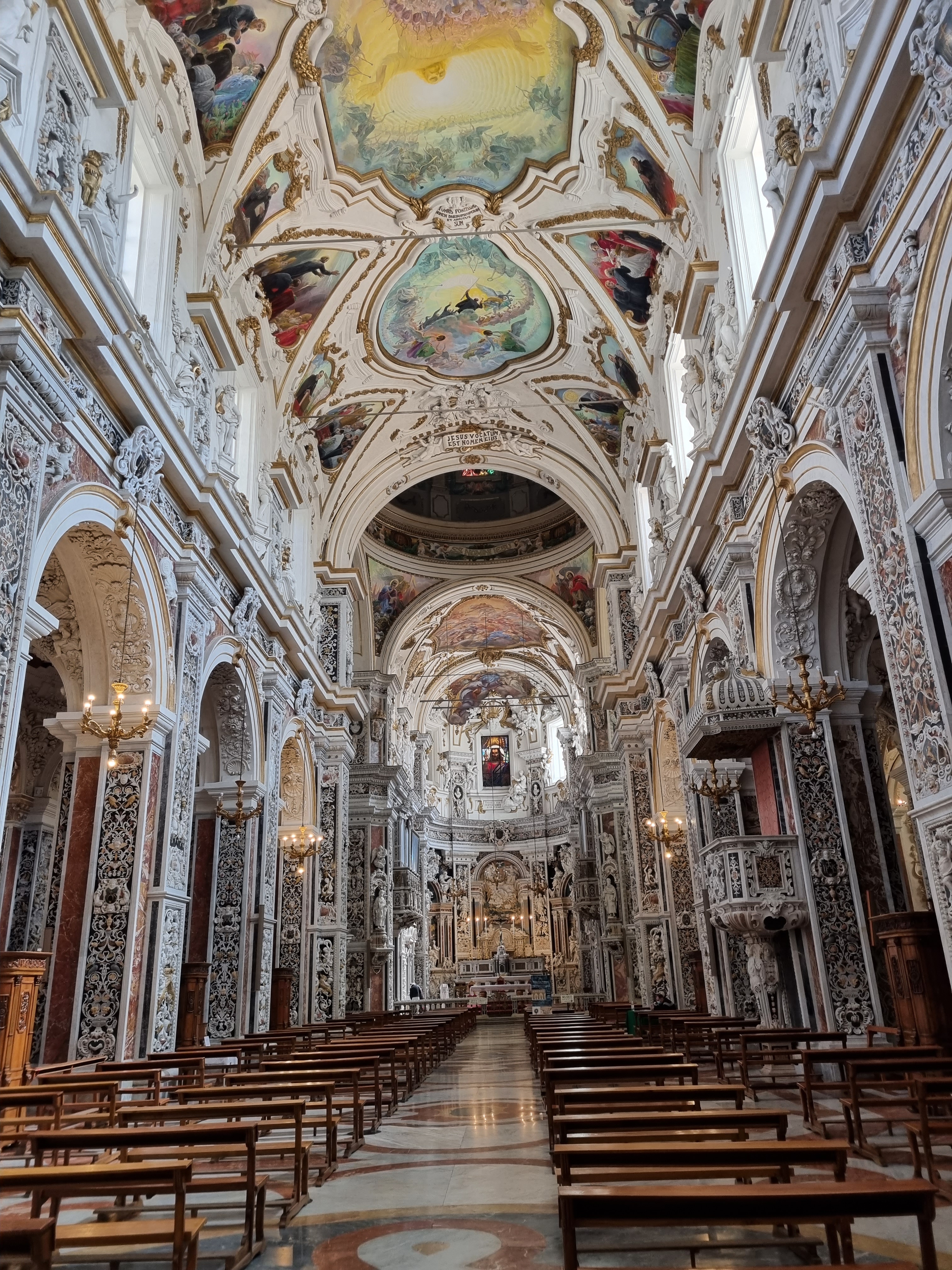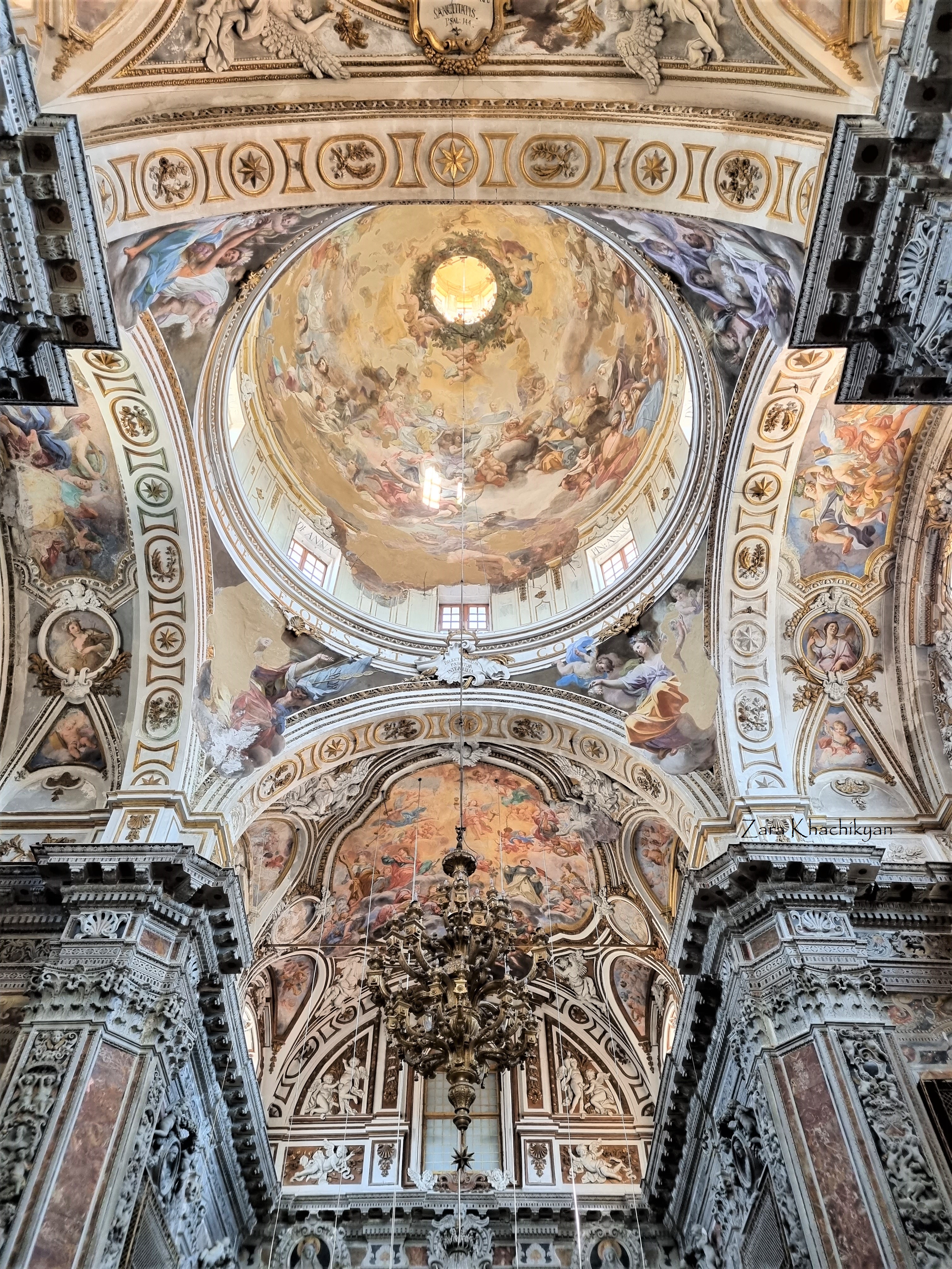 Ok, not everything was not planned in our trip. There was a church that was marked as one of the “places to go” in my Google Maps and it was the Chiesa del Gesù, which is also known as the Saint Mary of Jesus or the Casa Professa. It’s located in a few blocks away from Cathedral, hidden from eyes in a random place, behind residential buildings. It will take about 10 minutes to walk, but it’s definitely one of the places that you shouldn’t miss in Palermo. Gorgeous church with a majestic interior, full of breathtaking frescoes, sculptures and symbols. You may notice there the eye in the triangle which people relate to Illuminati. But it is actually a regular Christian (and not only) sign that symbolizes an eye of the God and an unlimited power of the God to see everything in the world. So called Eye of Providence or all-seeing eye. But look up at the ceiling and you will be admired with the giant painting of Jesus Christ in the middle. Inside the church there is also a museum that contains several rooms and halls, The Sacristy and The Crypt containing numerous treasures. In other words – this church is another gem to be seen.