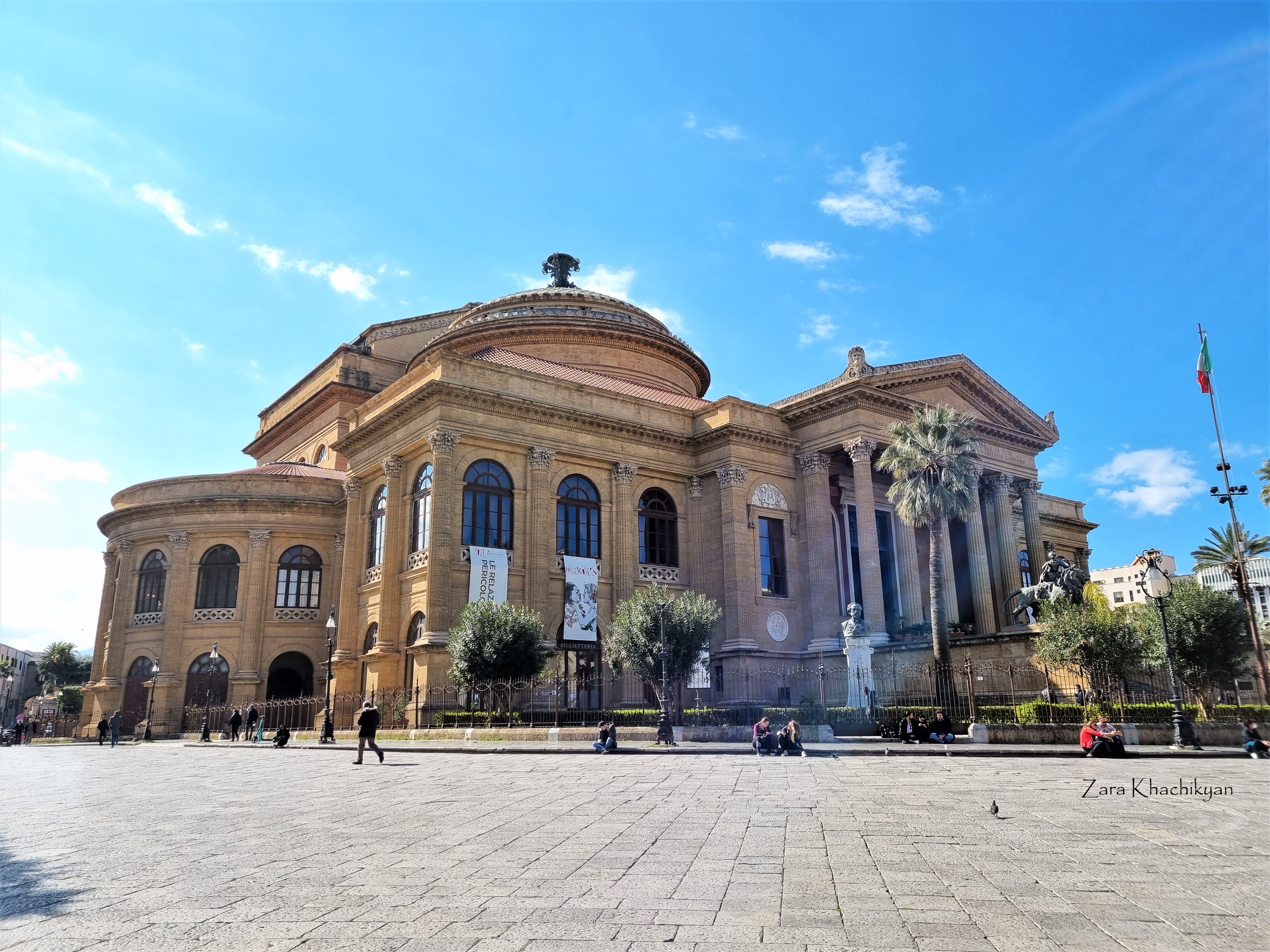 In the evening, when it’s already dark outside, but streets are full of active people, we had nothing to do then walk the streets too. We were checking all the big and small streets and corners, looking around, enjoying the soft chill weather, when we reached a big square, where a music was heard. There was a group of people listening to music loudly and some others were dancing in the streets. And between those “dancers” we could notice people of different age, starting from a little kid to the older aged man (he could be around 70-80 y.o.). Everyone was enjoying the music and having fun around. And just behind this crowd we noticed a huge building with columns lightened up in different colors. On the next day we came back on a daytime to see this building again and it turned out to be the famous Teatro Massimo, the biggest opera house in Italy! It is also one of the largest ones in whole Europe and is well known for its perfect acoustics! It would be a really nice experience to visit it not to see the interior only, but to enjoy some music as well, to feel the magical atmosphere inside..