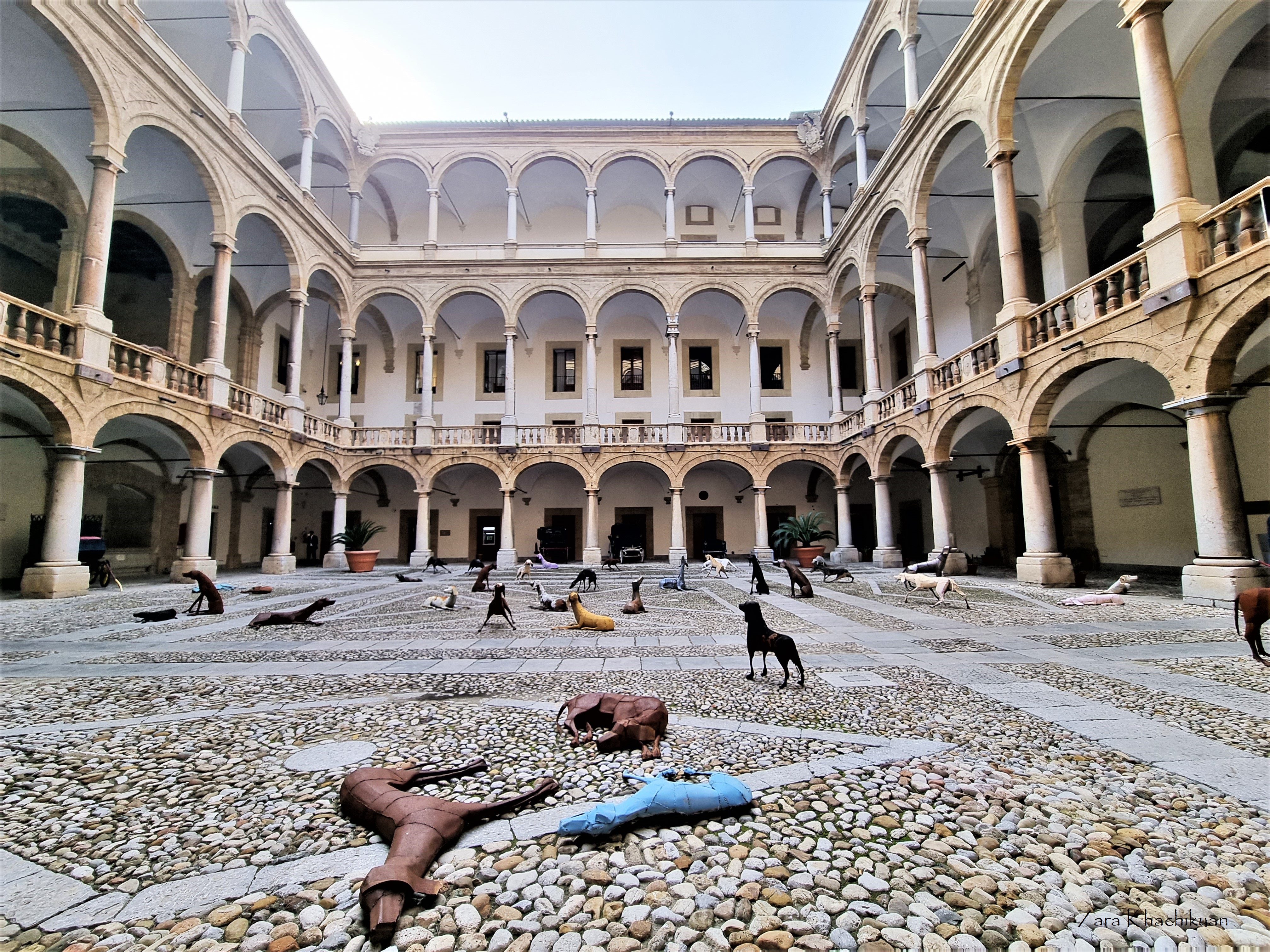 The day has come and we had to leave Palermo for another city trip, but before our train, we still had some time to be here. And when we were talking about how shall we spend last few hours in Palermo, our hotel receptionist asked where had we been and what saw there. And he was honestly surprised to know that we still didn’t see the Palazzo Reale or Palazzo dei Normanni (Royal palace or Norman Palace), which is a must seen place in Palermo (one along another ones from this big list). We quickly checked where is it and how much time will it take to go, check and be back, and decided to “run” to see it before leaving the city. As we were informed, this Palace was open to visitors only on weekends, as on the weekdays it is still functioning as the seat of the Sicilian Regional Assembly since 1946. All we could see there was the 17th century courtyard of the seat of the Kings of Sicily. The building is the oldest royal residence in Europe, and was the private residence of the rulers of the Kingdom of Sicily and the imperial seat of Frederick II and Conrad IV (king of Sicily and his son). Here in this courtyard there were a lot of dogs, not real ones, but made from iron. However, they all were made in their real sizes, representing royal dogs that used to lived here.