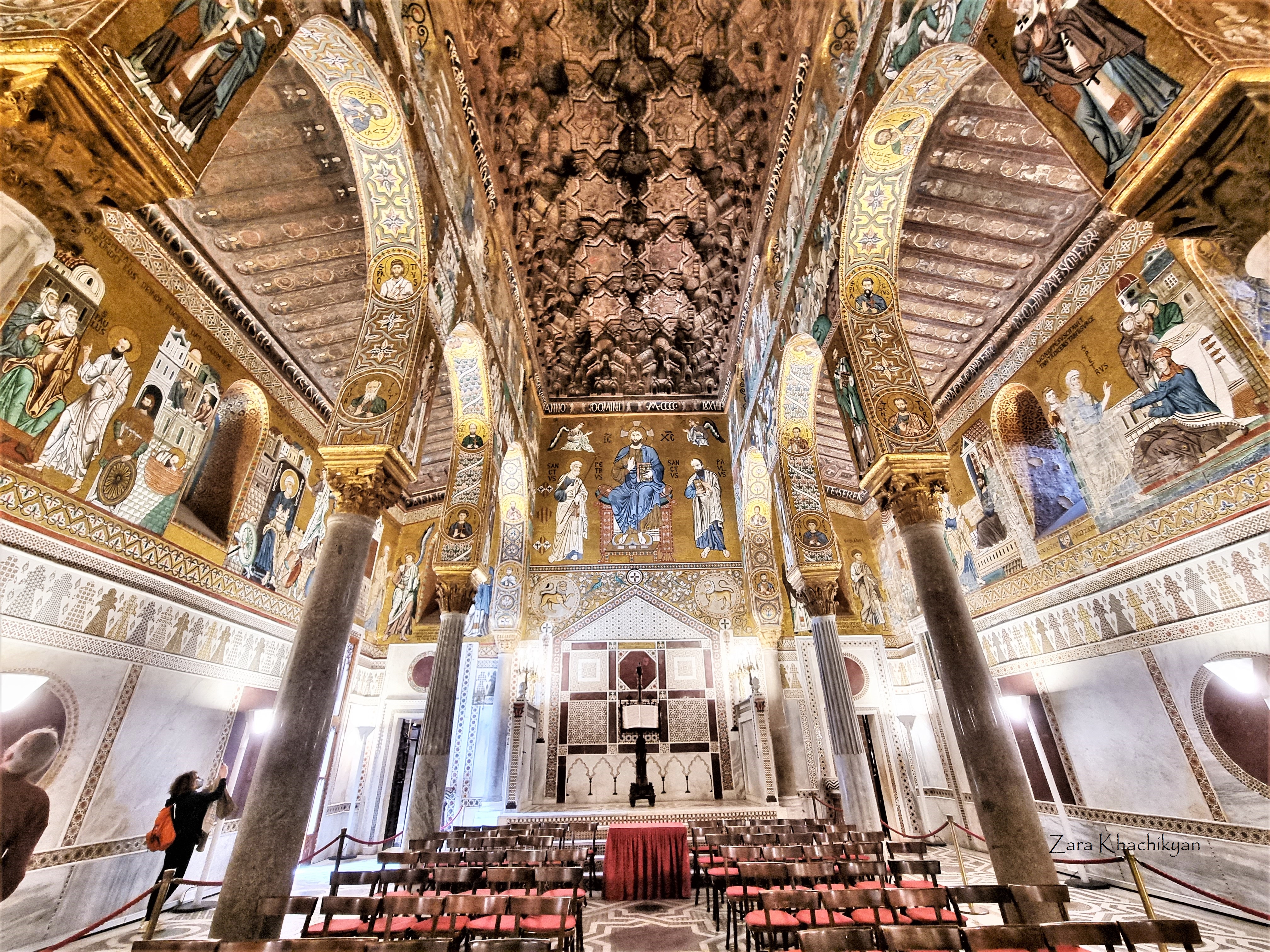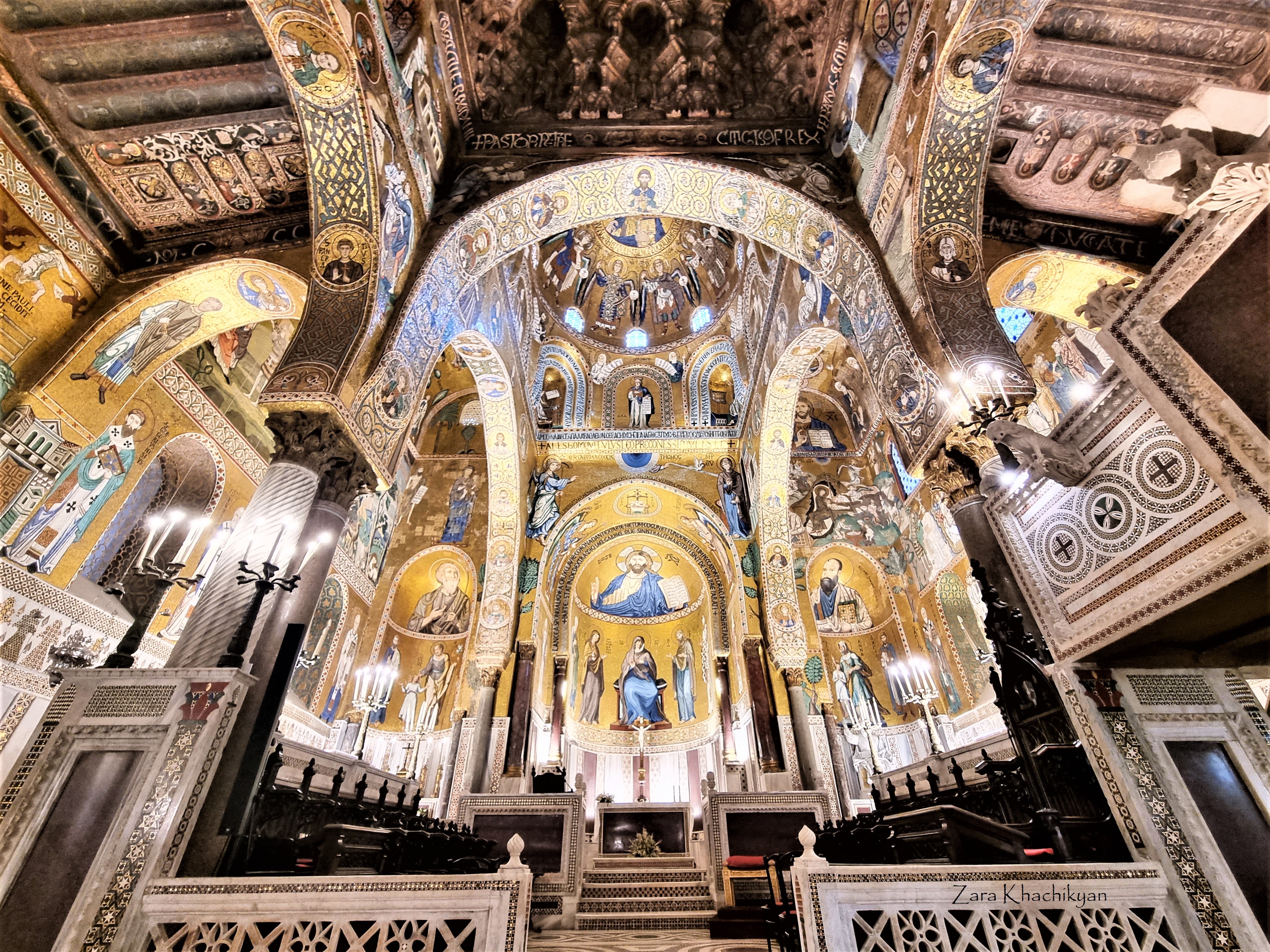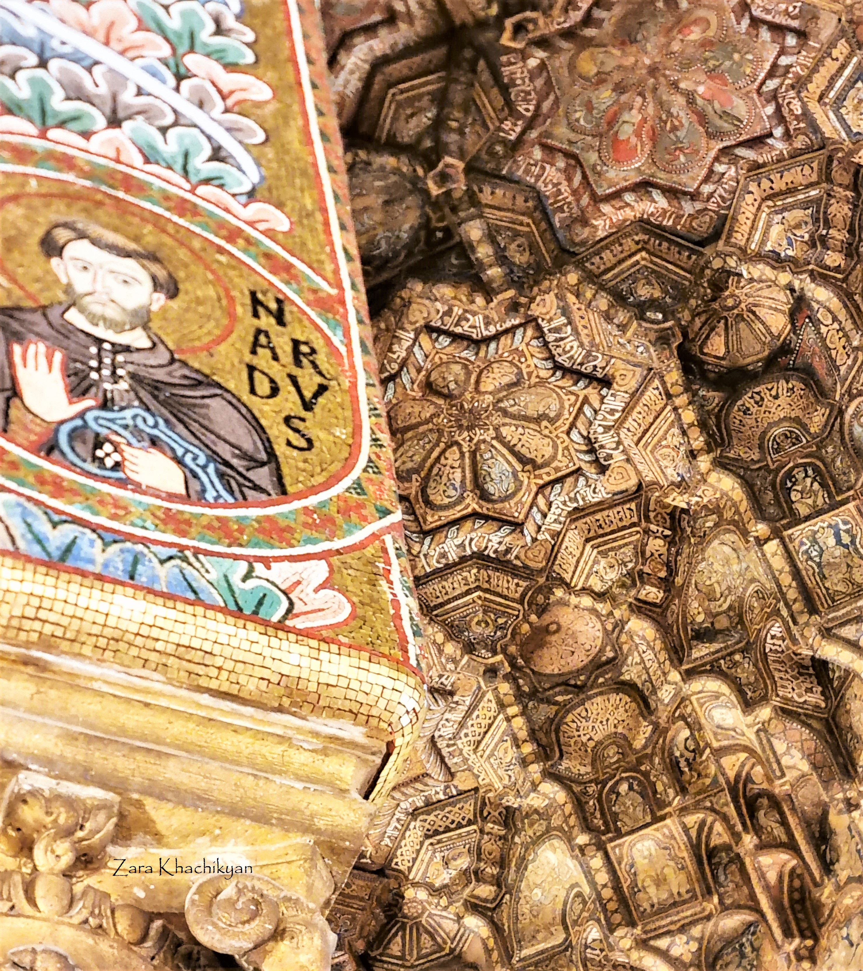 After a very strong security check we were allowed to enter the The Palatine Chapel (Cappella Palatina), which was the royal chapel of the Norman kings of Kingdom of Sicily starting from 1132. It was situated on the second floor at the center of the Norman Palace in Palermo. The chapel is a great symbol of multi-cultural cooperation. Craftsmen of three different religious traditions worked alongside each other. It’s said that originally there were 50 windows designed to illuminate at all times of the day the stories told on the wall. The texts in the chapel are written in Greek, Arabic and Latin. Today those windows are blocked. But even without them, the interior of this chapel is amazing.