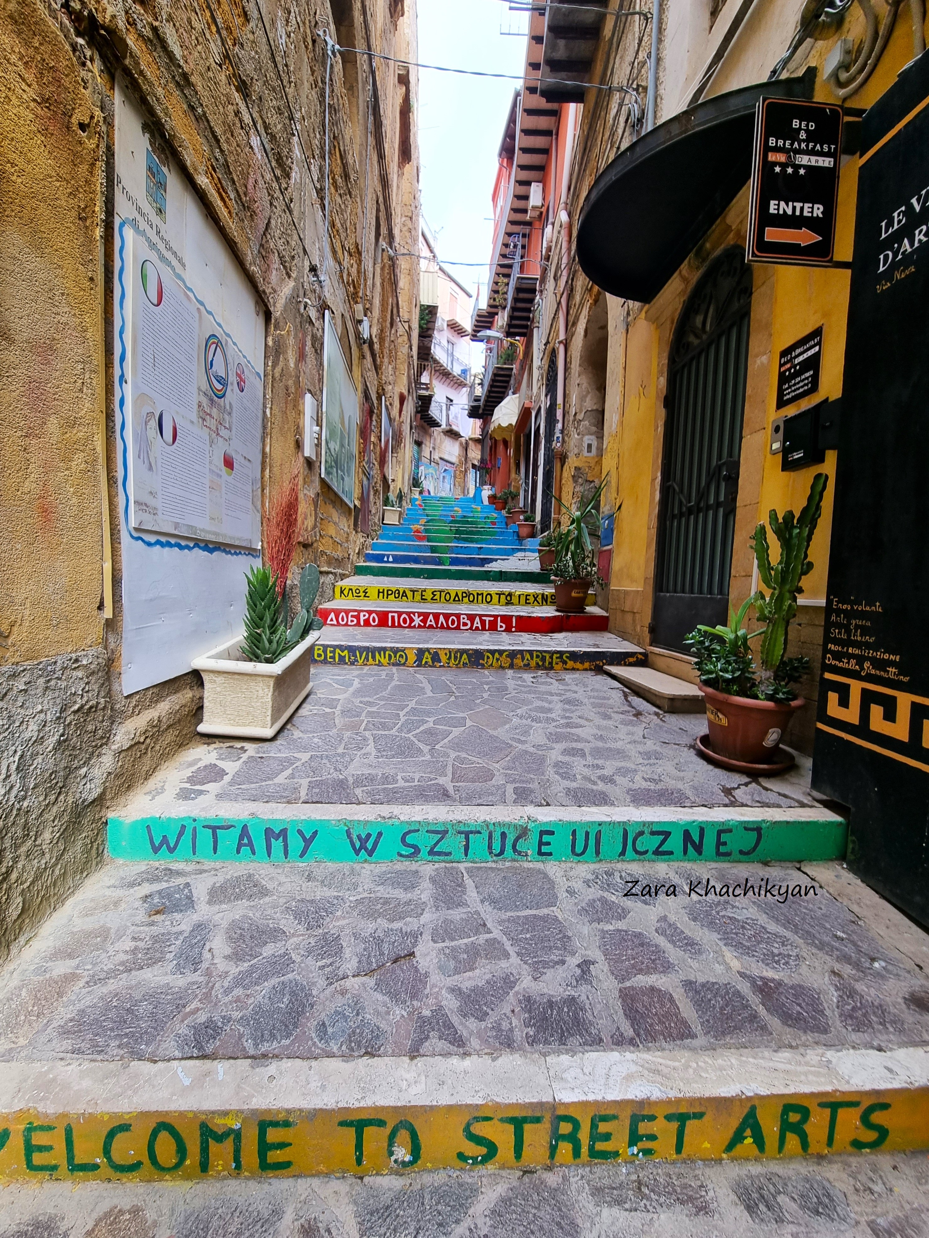 The journey in Sicily continues. After amazing Palermo and joyful Cefalù, the next stop was planned in Agrigento. This is a great place for people, who love archaeological sites, hostory, street strolling and good food (of course, we are in Italy!). And we also came here after interesting experiences by visiting Roman temples. The train from Palermo to Agrigento took around 2 hours and costed 11€. The first impression of the city was that everything was yellow. All the buildings around were in yellow pattern. The weather wasn’t the best, the sky was covered with dark clowds, but luckily wasn’t raining. And the first thing we had to do was to find our hotel, leave the luggage there and go after adventures. Our hotel owner sent us a video instructions, which helped us to find our place easily. It was in the Old Town of Agrigento, between narrow and beautiful streets, some of which had interesting art paintings. The room was big and bright, with a lovely view to the yard, and which was not less important, it was warm enough! After refreshing there, we made a light planning of the day and went out.