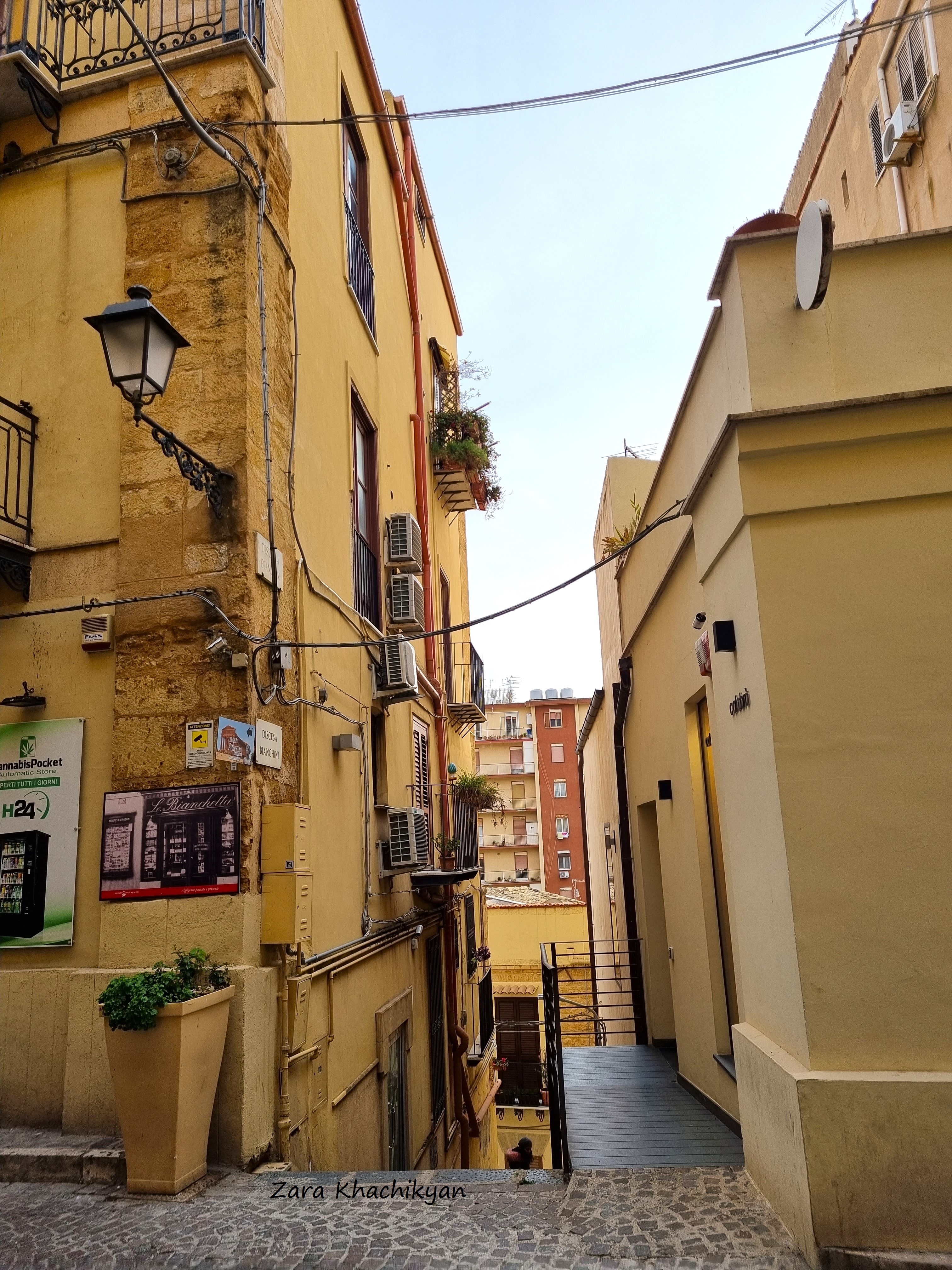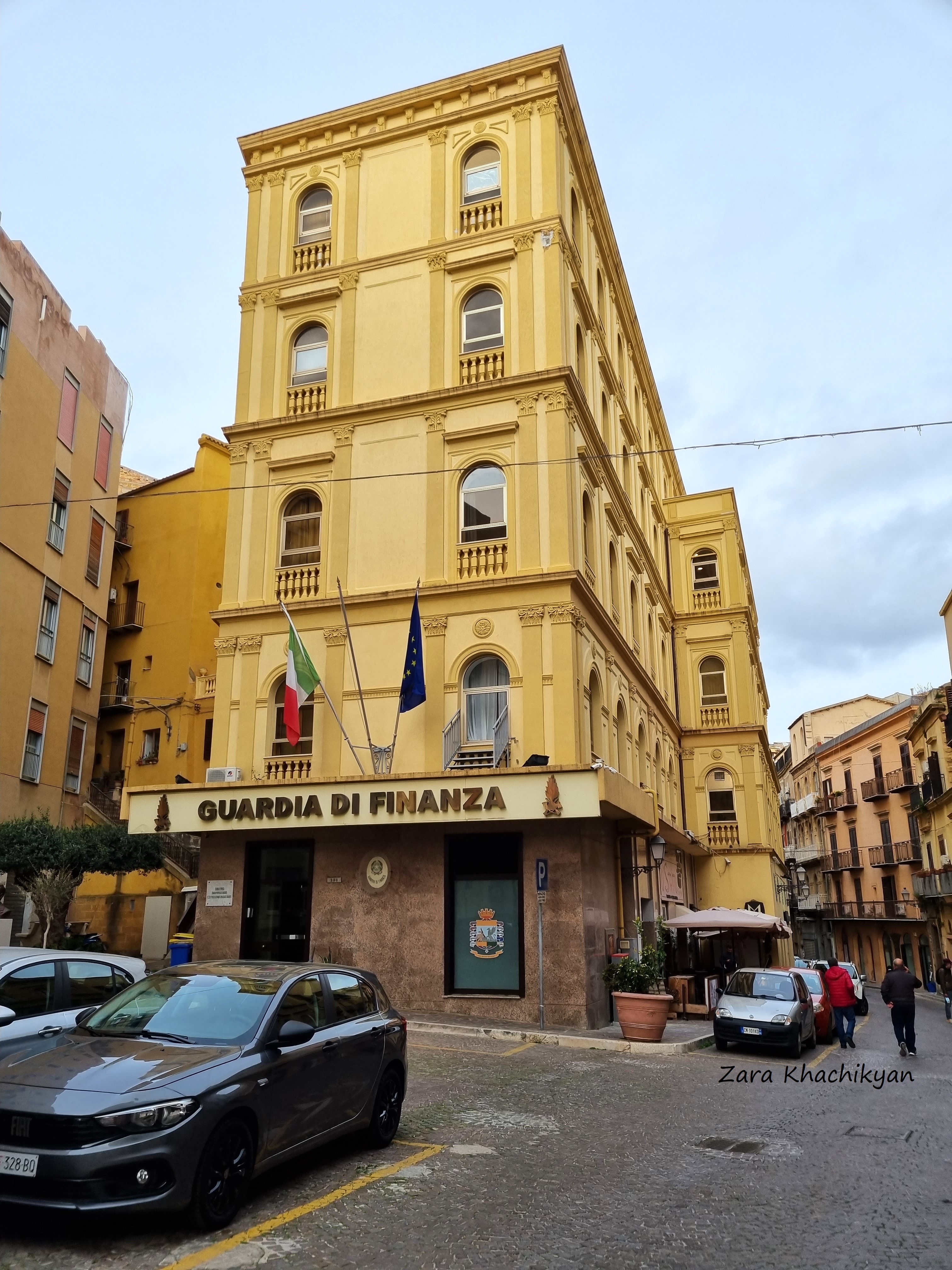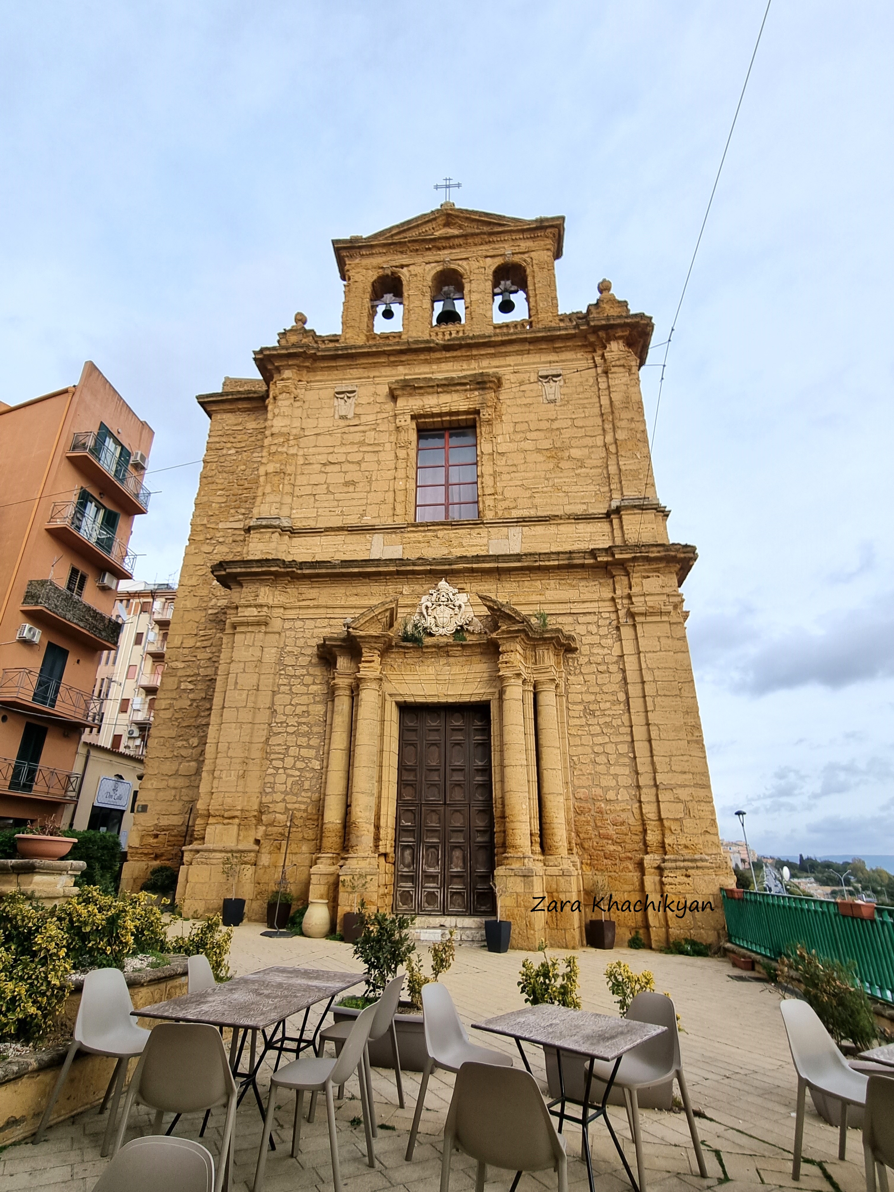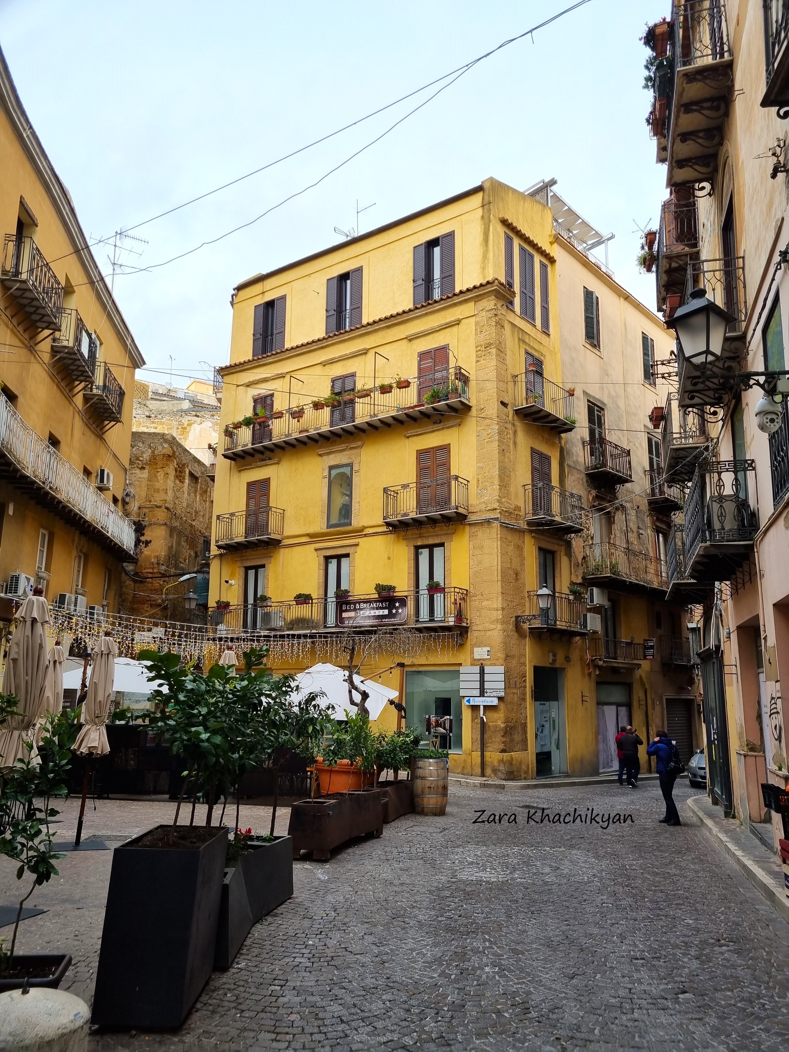 It was around 5pm, cold, windy. We were hungry, tired, disapointed and had to “climb” up another hour to get the city center. Finally we reached the center and started to look where can we have some food. But this is Italy, where everything is closed for dinner before 7-8pm. Definitely this wasn’t our day. Not only restaurants, but everything was closed! No any open market or even a clothing store was open. And it was not weekend! We started to check on Google which restaurant will be opened first, but it was too cold to stay outside before that. And no meaning to go to the hotel too (we didn’t come here to spend time in a hotel room, right?). So we found a small cozy place with 2-3 tables only, where we could warm up with a cup of tea and some sweets (at least to survive before dinner). Tea was perfect, sweets delicious. But we decided to go out and walk in the streets of Old Town of Agrigento until we find some place to eat. So we started to go around all the narrow streets, check all yellow pattern buildings, crossed by some churches, which also were closed, found few places from where we could see the city and the Valley of the Temples from above, and moved forward.