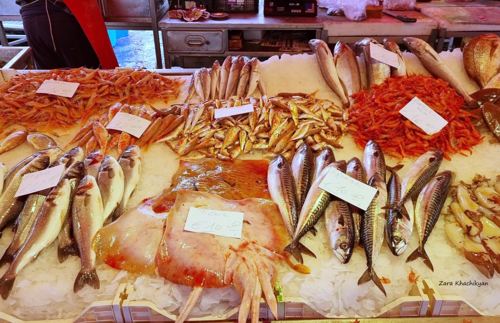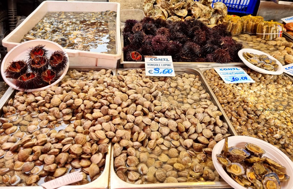By the way, the fish market (La Pescheria) is also a must visit place here. Every morning you can find fresh fish and other seafood, such as mussels, clams, shrimps and prawns, snails and much more. Besides seafood you can also find fresh and juicy fruits and vegetables. We bought here some wild strawberries and bloody oranges (as locals call it – Sanguinello), which are tipical fruits of Sicily and are healthiest choise for our body. If you will be in Sicily (or you can find it in other cities in Italy), don’t hesitate and try it. You will appreciate the unique taste. And don’t mix it with the known “red” oranges you see in supermarkets. These are totally different!