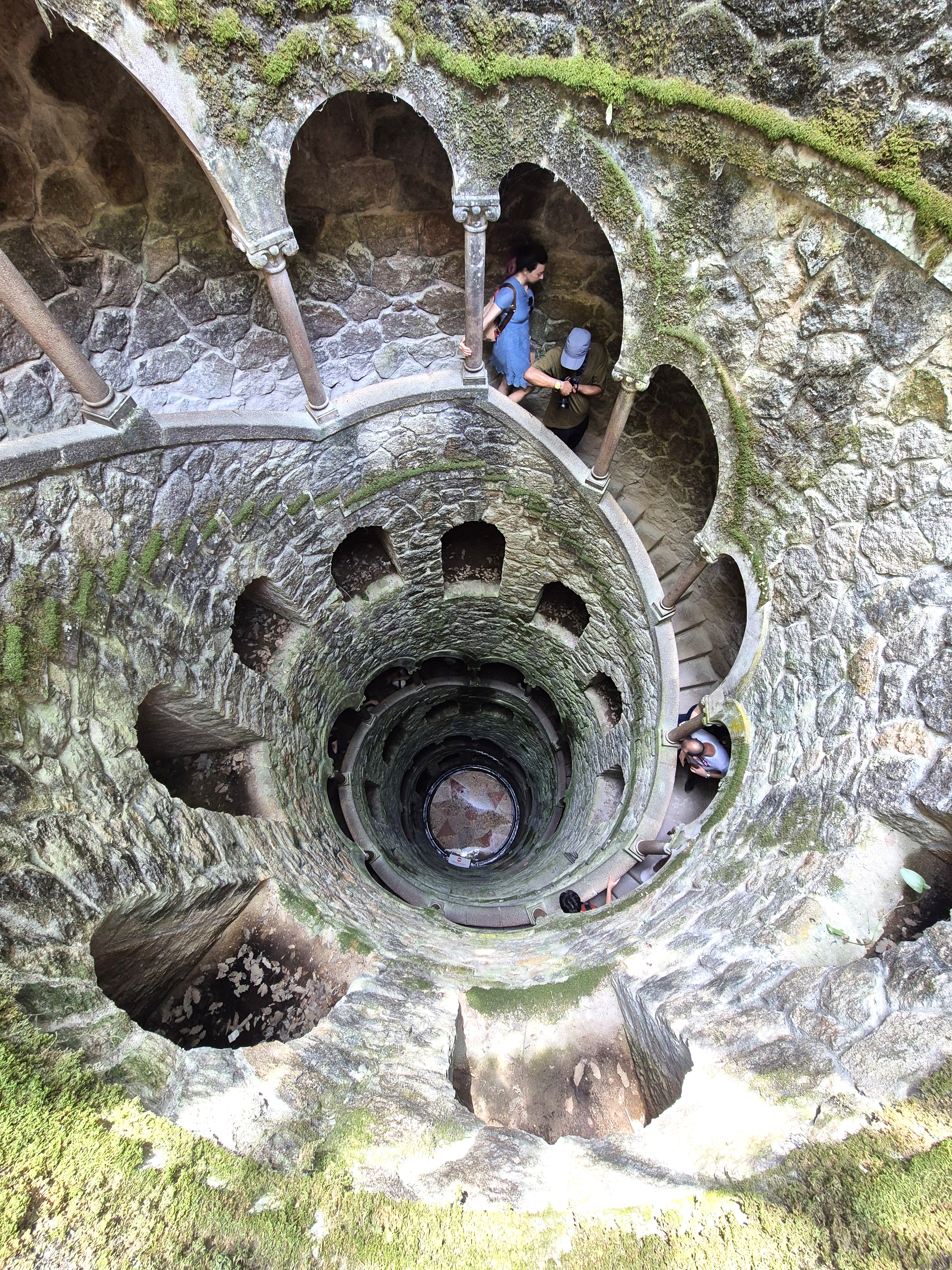 The palace was surrounded with a garden full of trees and flowers, that hide behind some other buildings such as chapel, towers greenhouse and of course the legendary Initiation Well. I believe most of the visitors are coming to Regaleira to see this mysterious spiraling down staircase, filled with Pagan and occult symbols. It has nine levels down (around 27m) and was designed to represent the nine circles of Dante’s Inferno. At the bottom of the well the floor was decorated with colored tiles in shades of ochre. Here, the tiles depict the cross of the Knights Templar, a symbol exclusive to Free Masons who believe in the Christian doctrine. Once you reach the bottom, you will have access to the grottos which will lead you to the hidden waterfalls.